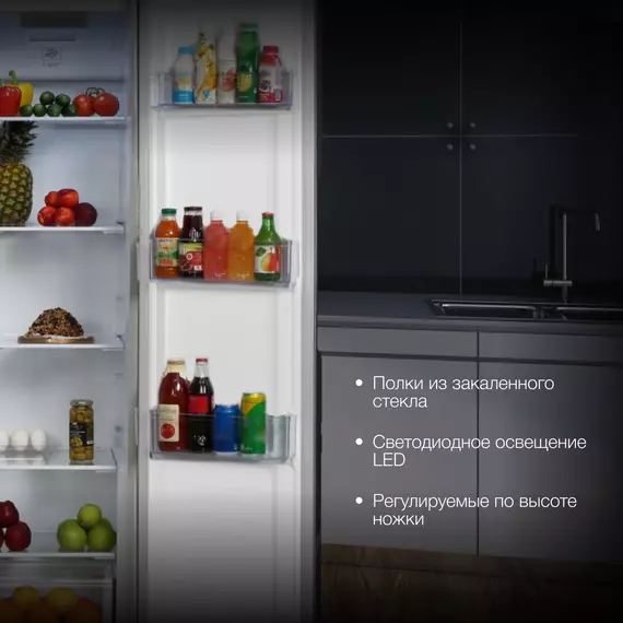 Регулируемые по высоте полки из закаленного стекла и выдвижные ящики позволяют распределять продукты, чтобы было удобно их хранить и доставать. Дополнительно при открывании дверцы холодильной камеры включается светодиодное освещение. В дверках холодильника предусмотрены дополнительные вместительные полки для хранения напитков, детского питания и продуктов в компактных упаковках.