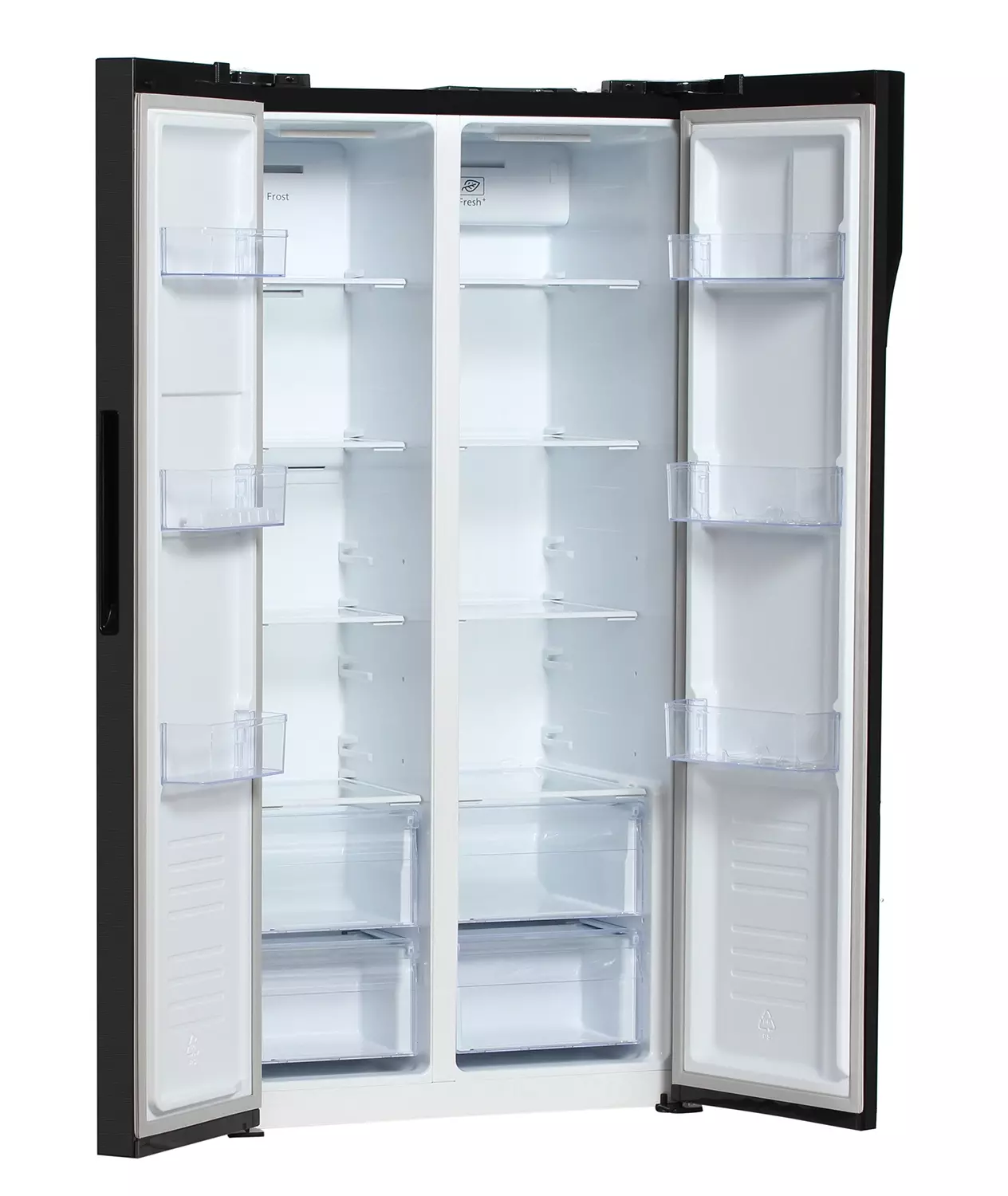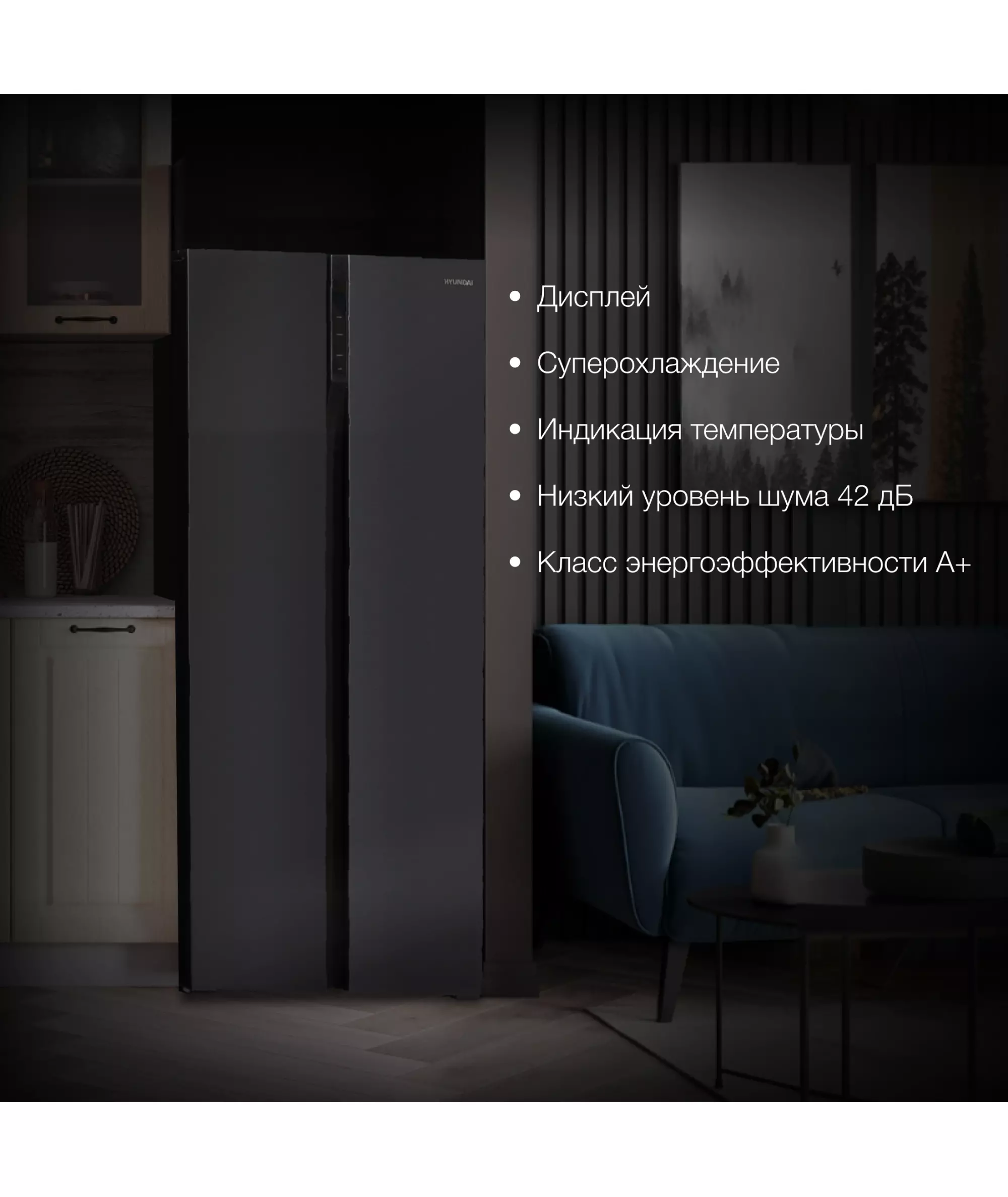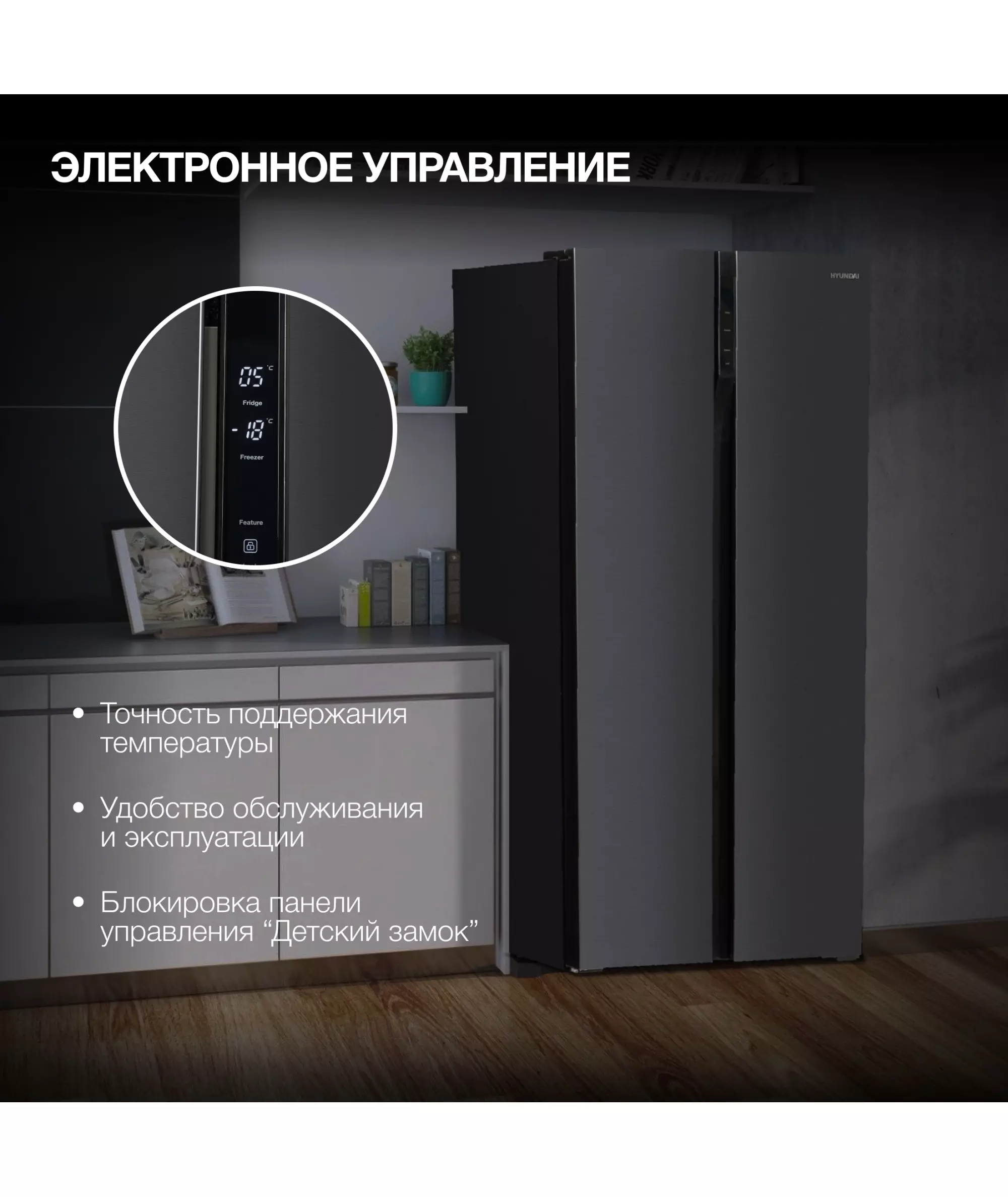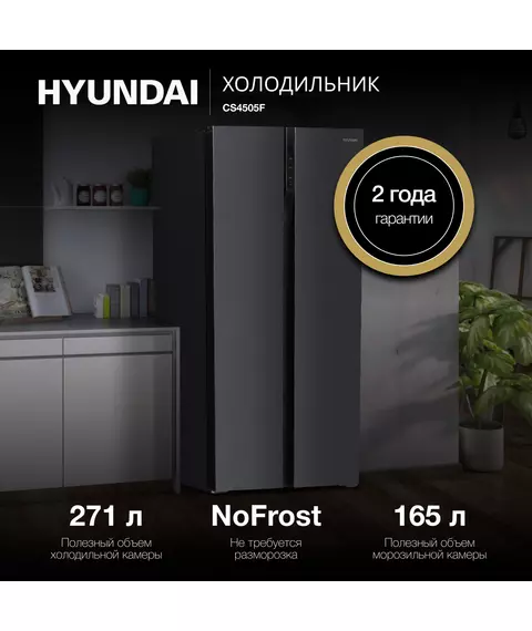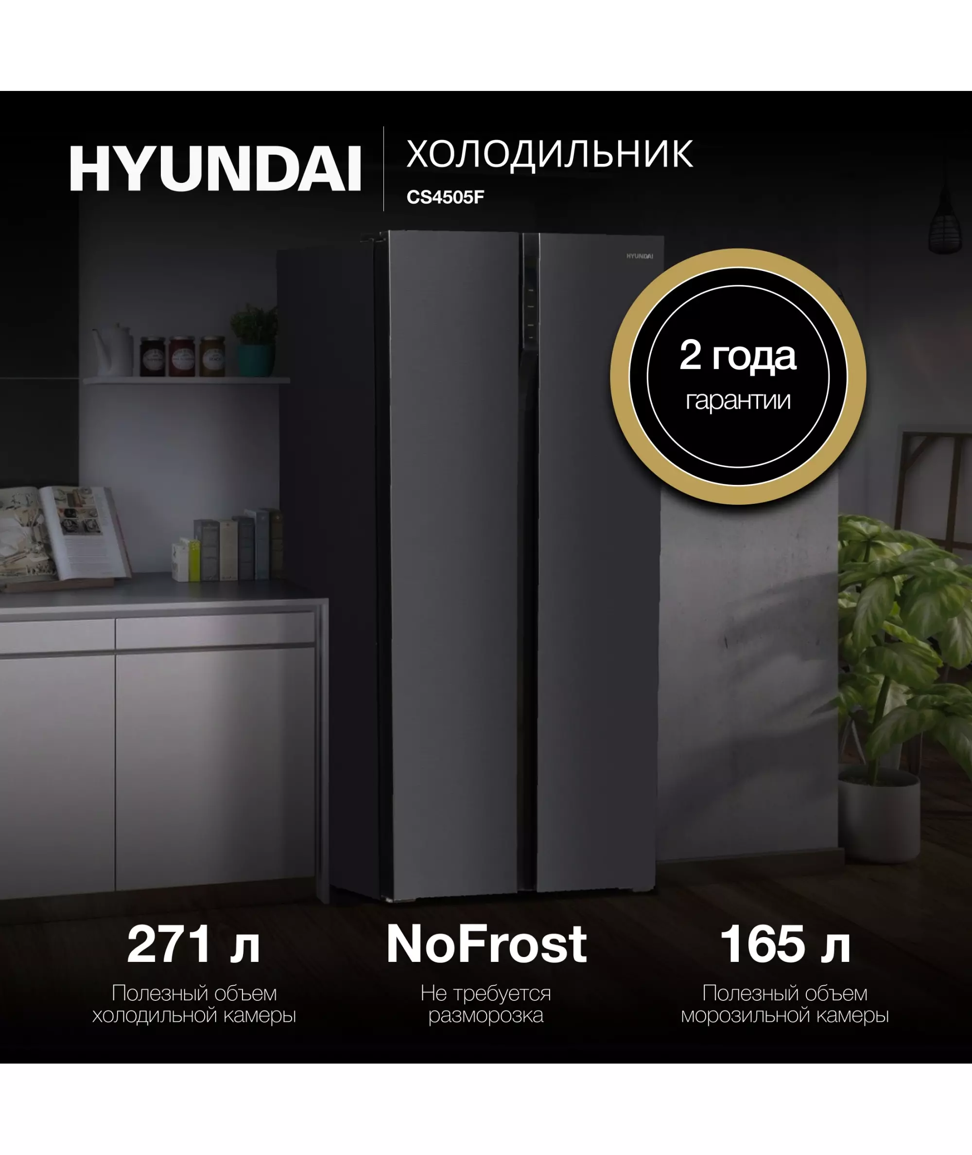 Тем, кто при выборе холодильника обращает внимание на модели с большим объемом, оптимально подойдет 2-х камерный холодильник HYUNDAI CS4505F (тип Side by Side) выполненными из нержавеющей стали в стильном черном исполнении.