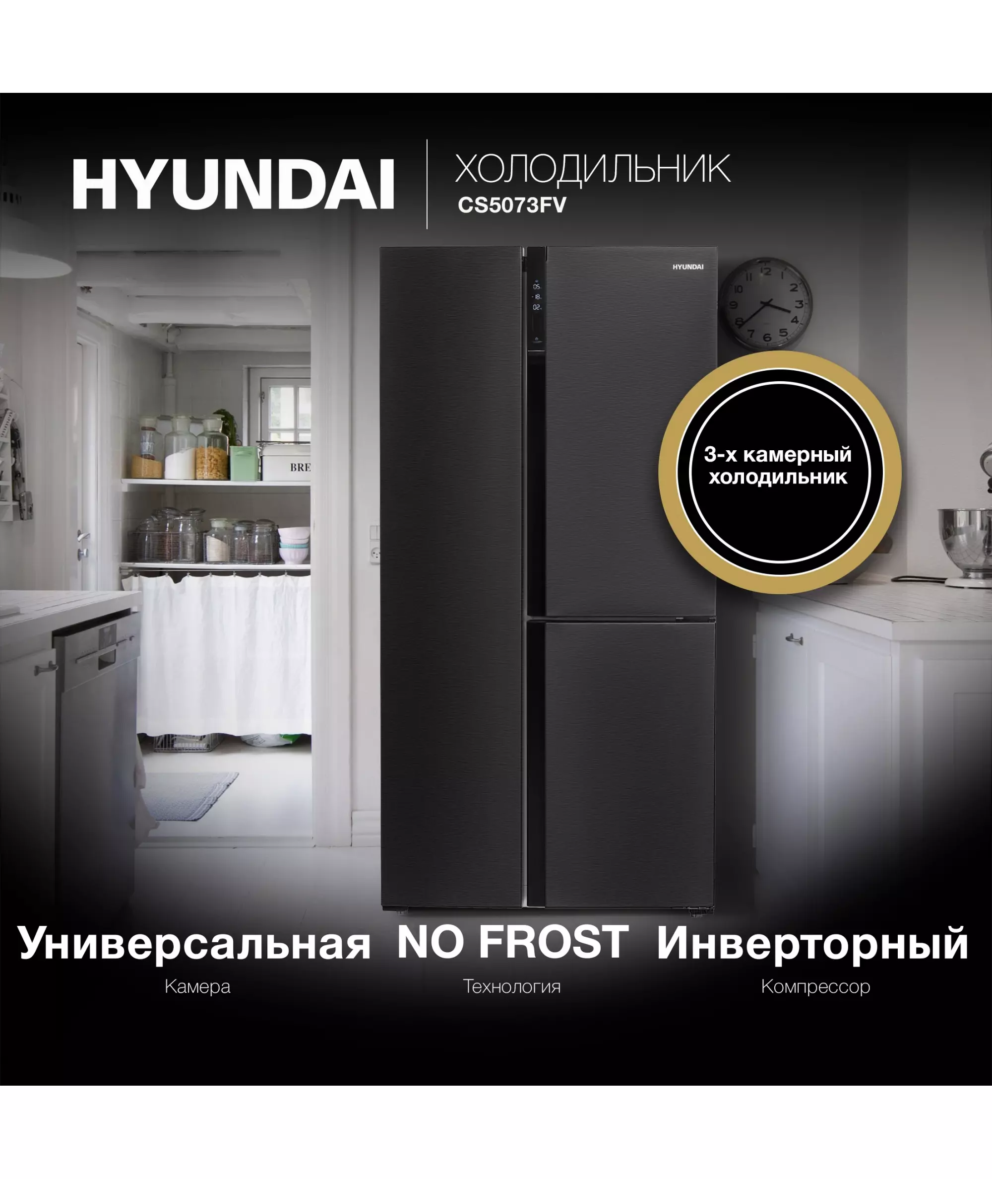 Холодильник Hyundai CS5073FV графит 3-хкамерный, инвертер