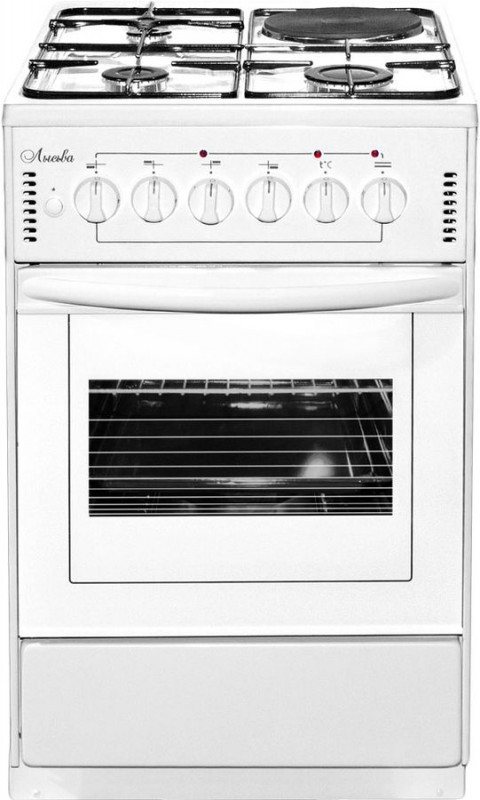 - Плита сочетает в себе преимущества быстрого приготовления на газе и экологичность электричества. На варочной панели расположены три газовые горелки, причем две из них очень мощные, их применяют, когда нужно готовить быстро или в большой посуде. Еще один очаг — электрический, его включают, если есть перебои с газом, или используют постоянно. Духовка электрическая. Она равномерно готовит блюда, эффективнее поддерживается заданная температура. Два нагревательных элемента сверху и снизу позволяют хорошо пропекать самые различные блюда. Нагреватели можно включать по отдельности или вместе, когда требуется нагрев со всех сторон. В плите предусмотрен режим подачи малого газа.