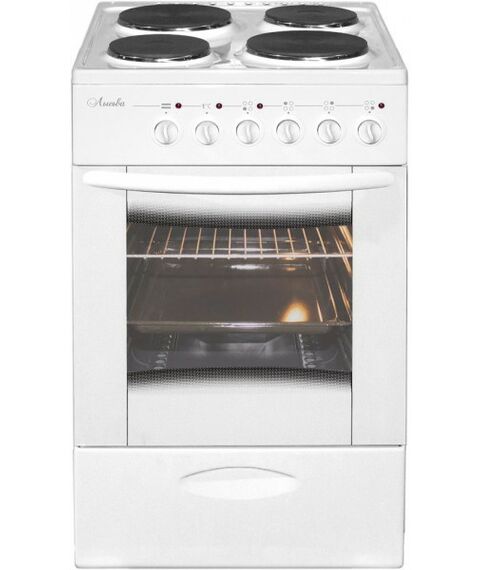 Четырехконфорочная электрическая плита с мультифункциональным духовым шкафом, со стеклянной крышкой и покрытием из жаростойкой эмали белого цвета.