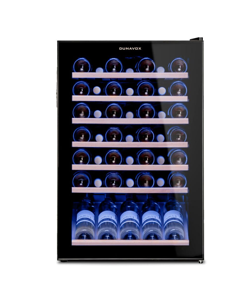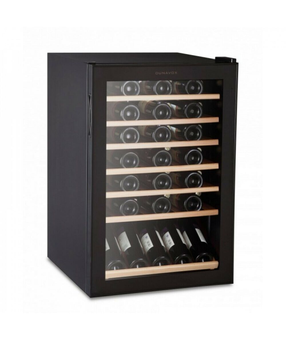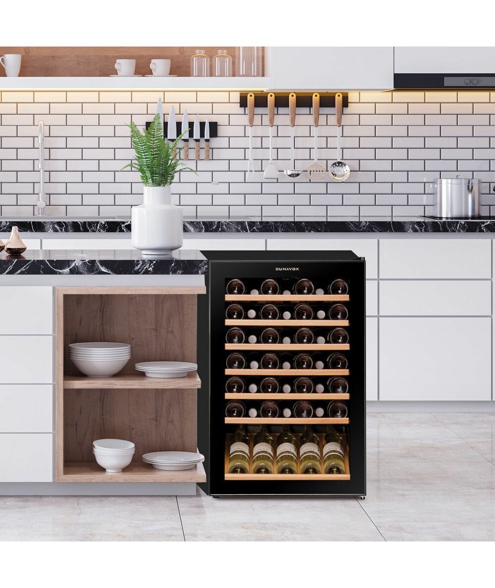 - Компрессорный винный шкаф Dunavox DXFH-48.130 обладает средней вместимостью и способен разместить в себе до 48 бутылок. Располагаются они на выдвижных полках из массива бука.