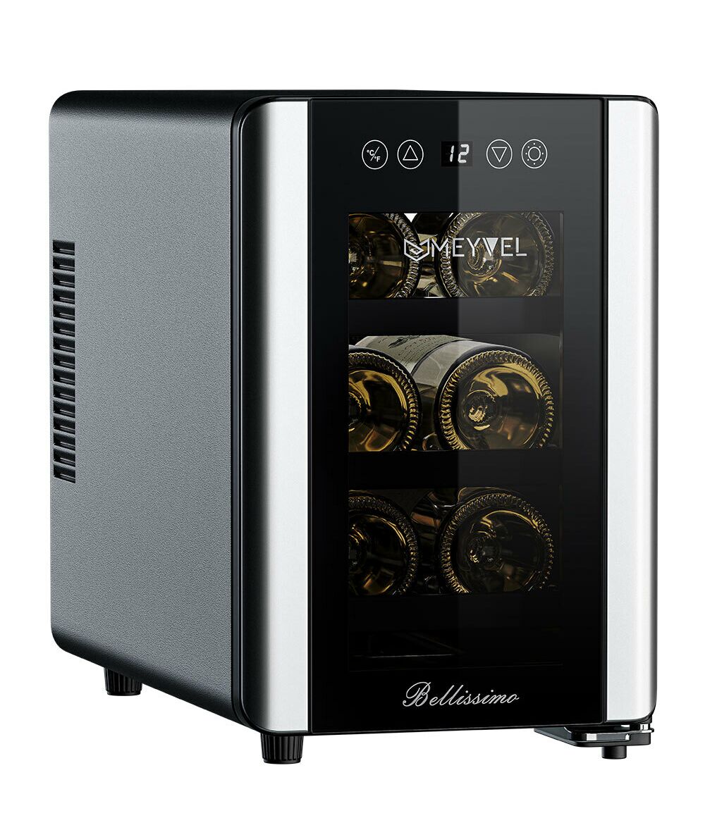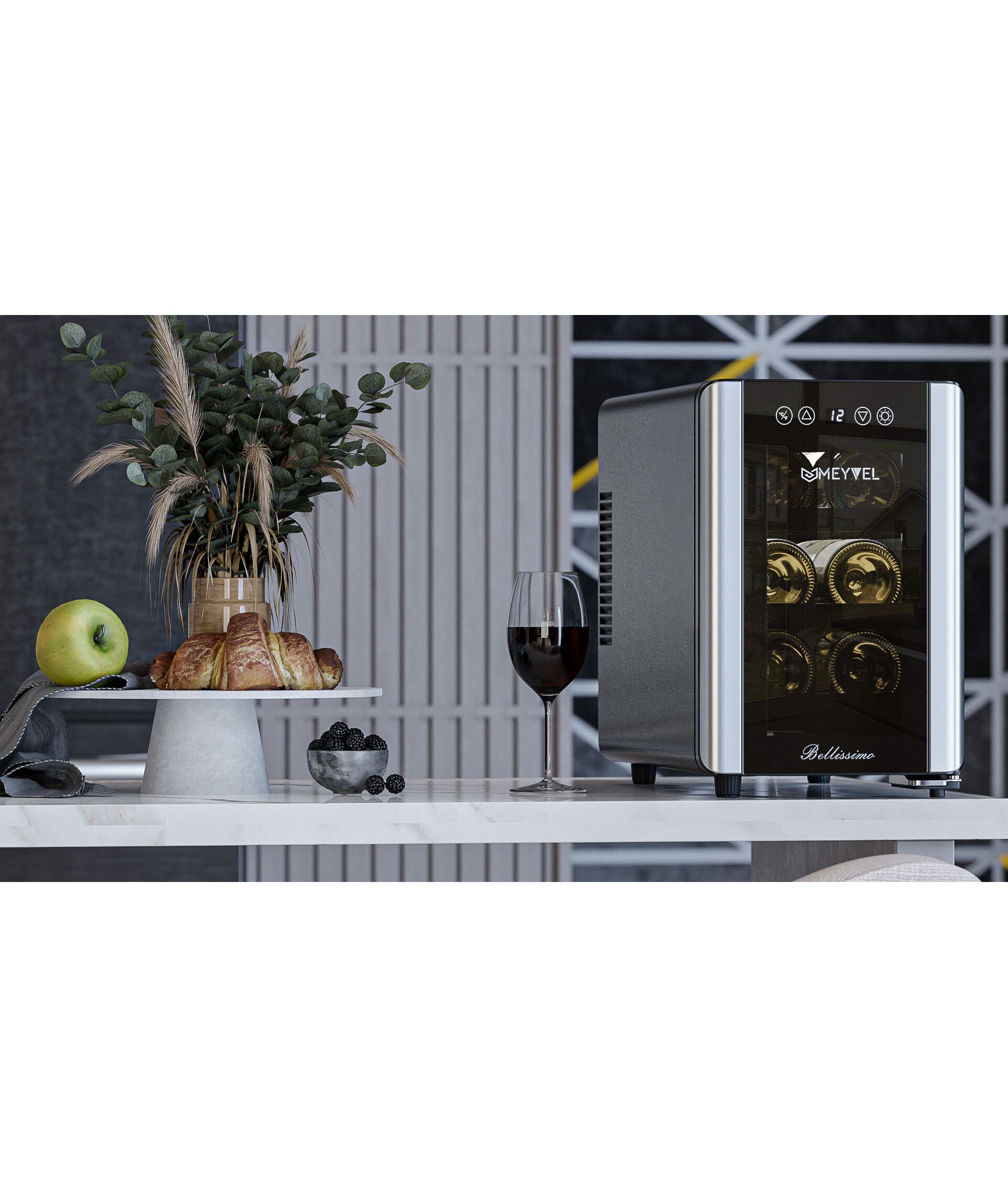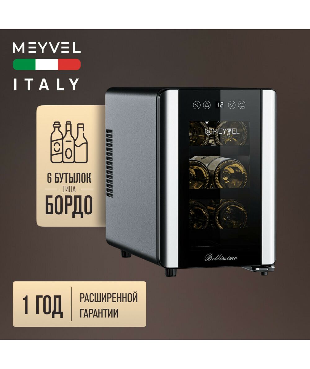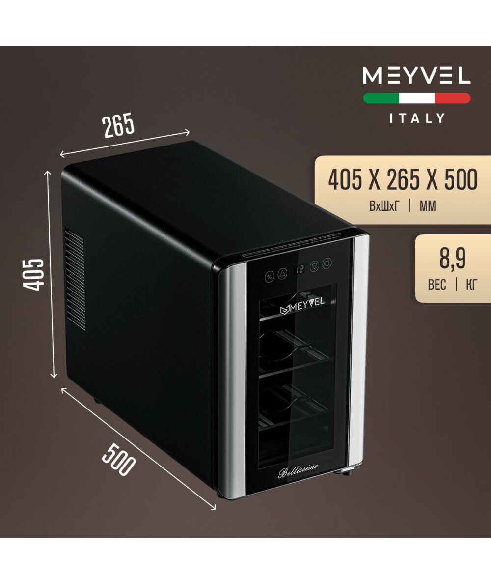 - Термоэлектрический винный шкаф Meyvel MV06-BSF1 (easy) обладает небольшой вместимостью и способен разместить в себе до 6 бутылок.