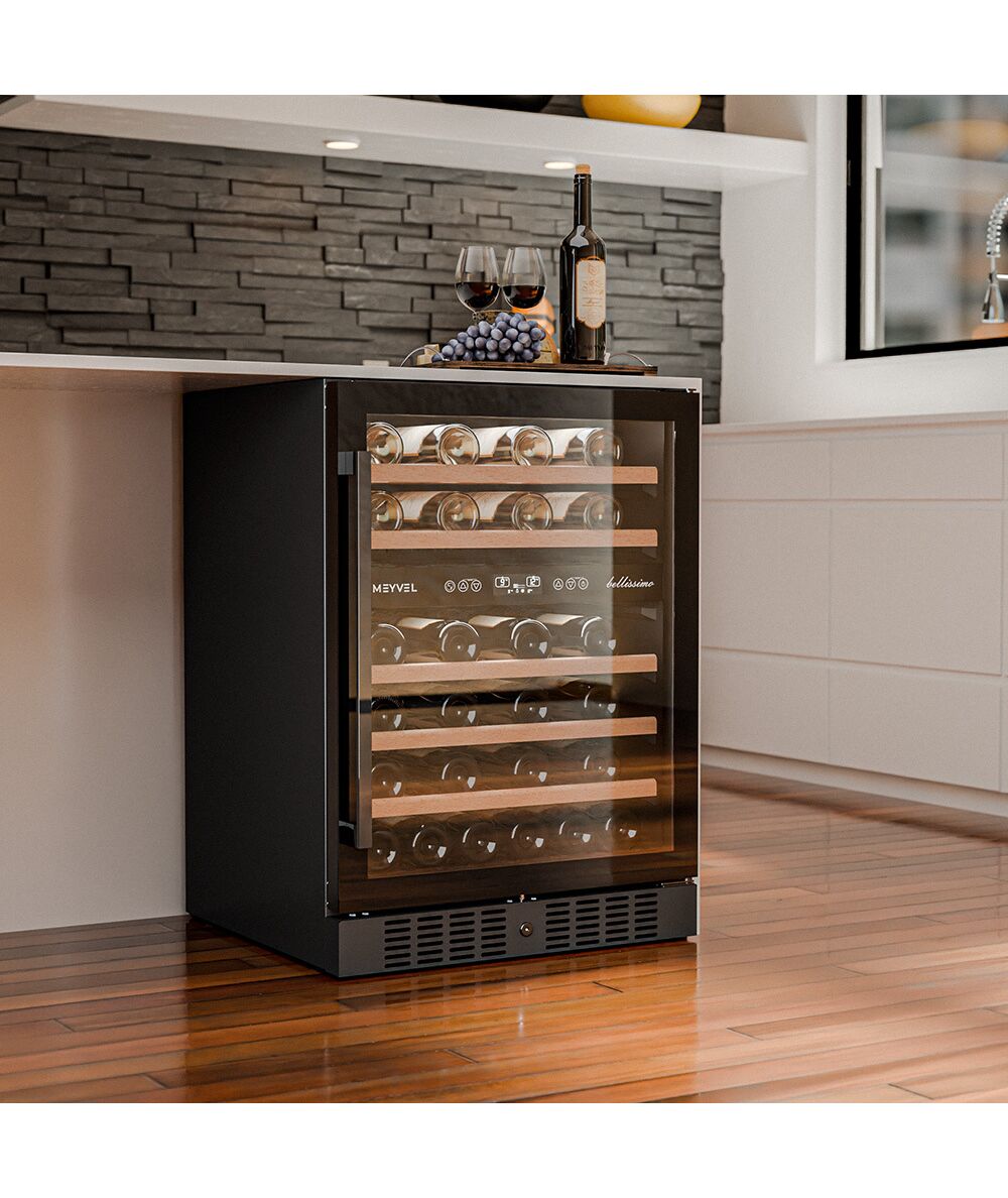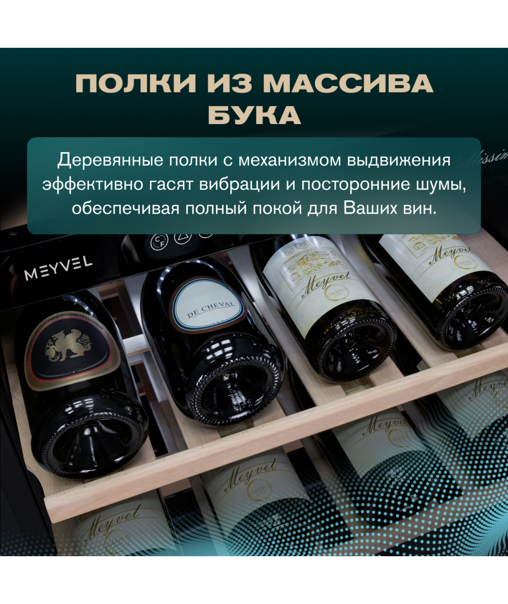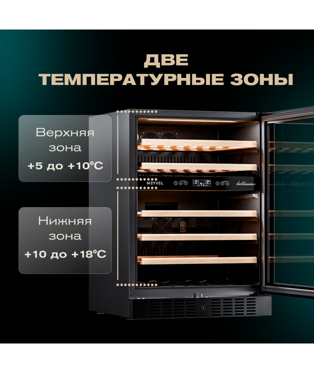 Компрессорный винный шкаф Meyvel MV46-KBT2 обладает большой вместимостью и способен разместить до 46 бутылок. Располагаются они на полках из массива бука. Внутреннее пространство шкафа разделено на 2 температурные зоны с возможностью настраивать каждую из них (верхняя зона имеет диапазон от +5