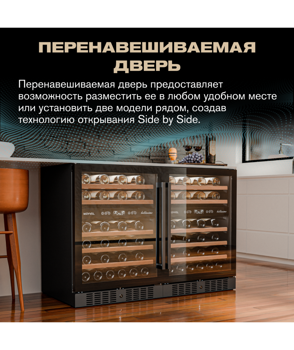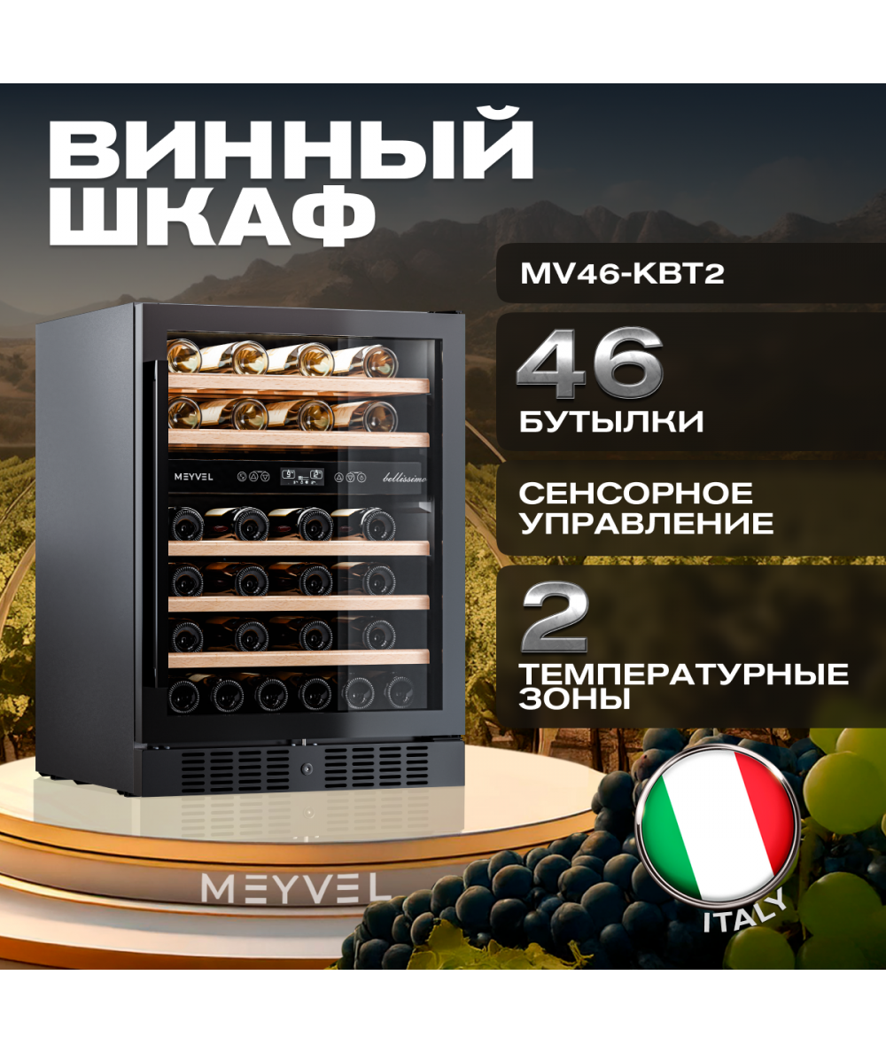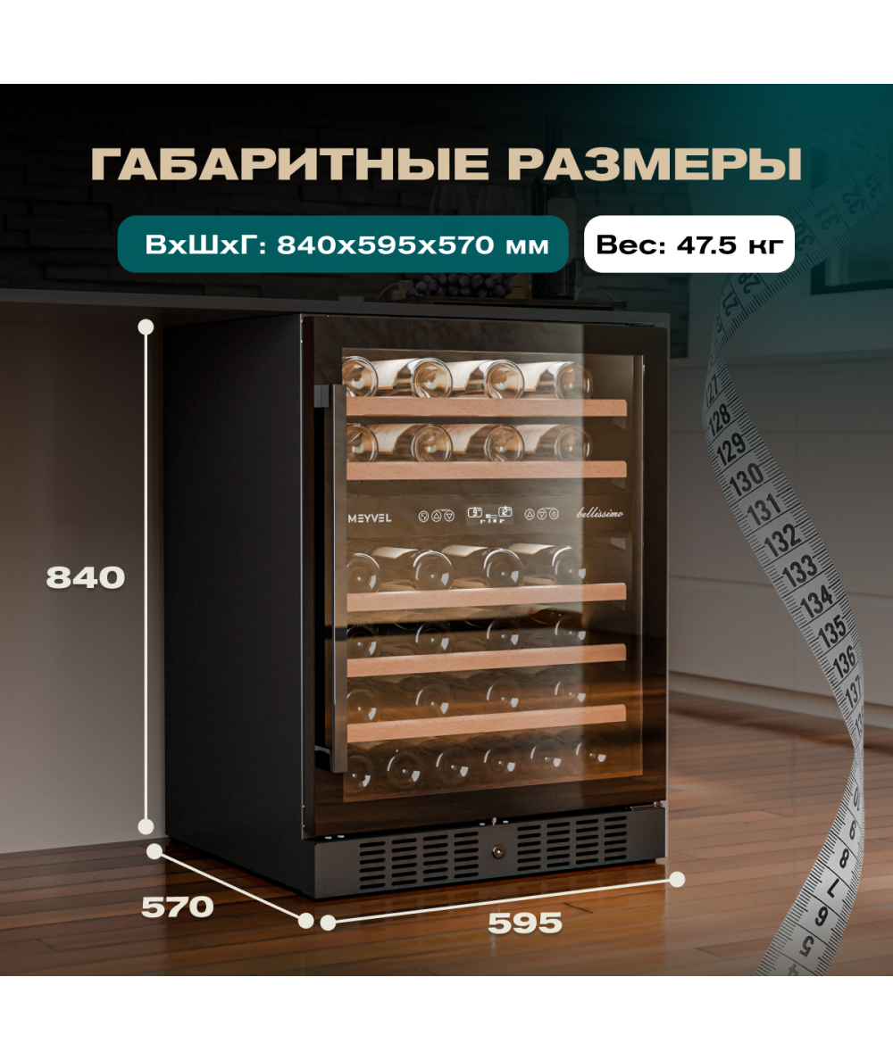 Модель MV46-KBT2 имеет привлекательный внешний вид, сочетающий в себе неподвластное времени очарование натуральных материалов с высокотехнологичными системами сохранения продуктов. Винный холодильник Meyvel MV46-KBT2 оснащен дверью с защитой от ультрафиолетовых лучей и отлично подойдет для хранения и созревания различных сортов вин. Динамическая система охлаждения обеспечивает оптимальную температуру для вина и сохраняет необходимую влажность внутри камеры.
