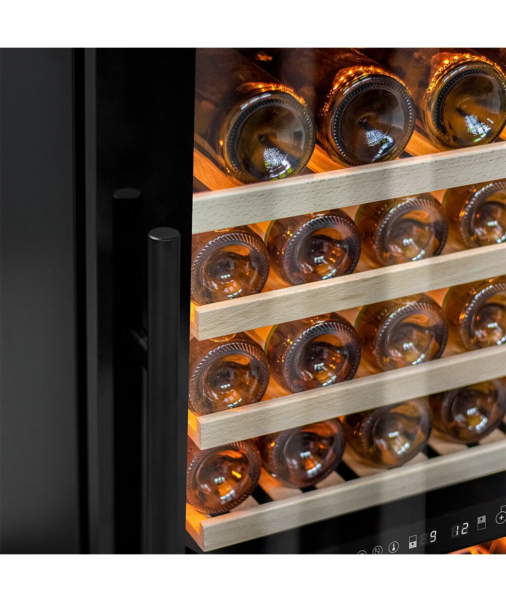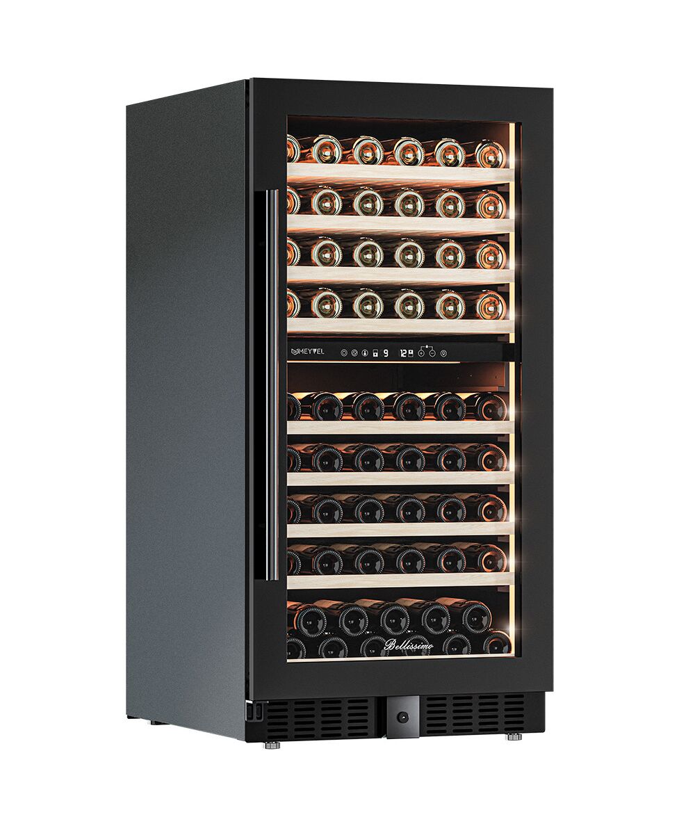 - Компрессорный винный шкаф Meyvel MV99PRO-KBT2 обладает большой вместимостью и способен разместить до 99 бутылок. Располагаются они на полках из массива бука. Внутреннее пространство шкафа разделено на 2 температурные зоны с возможностью настройки в диапазоне от + 5°C до +20°C. Холодильник поддерживает влажность в диапазоне 60-80%, как в настоящем винном погребе.