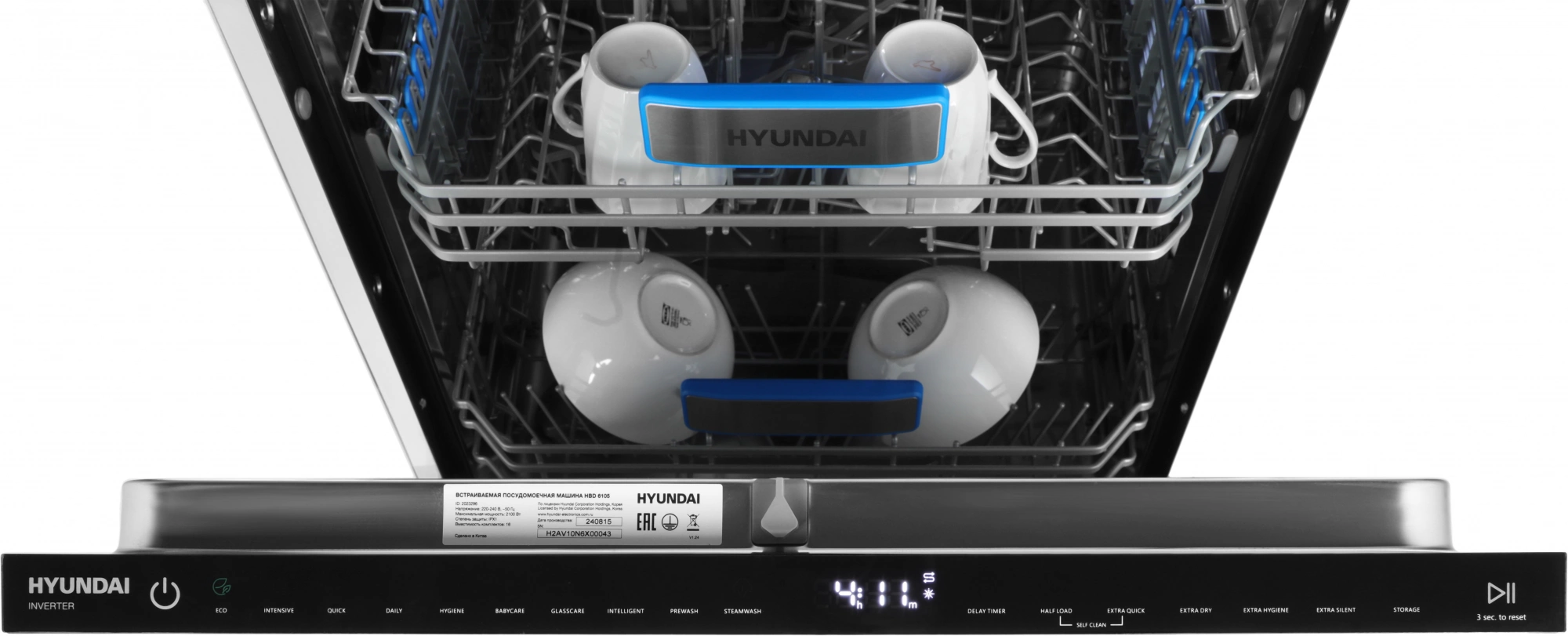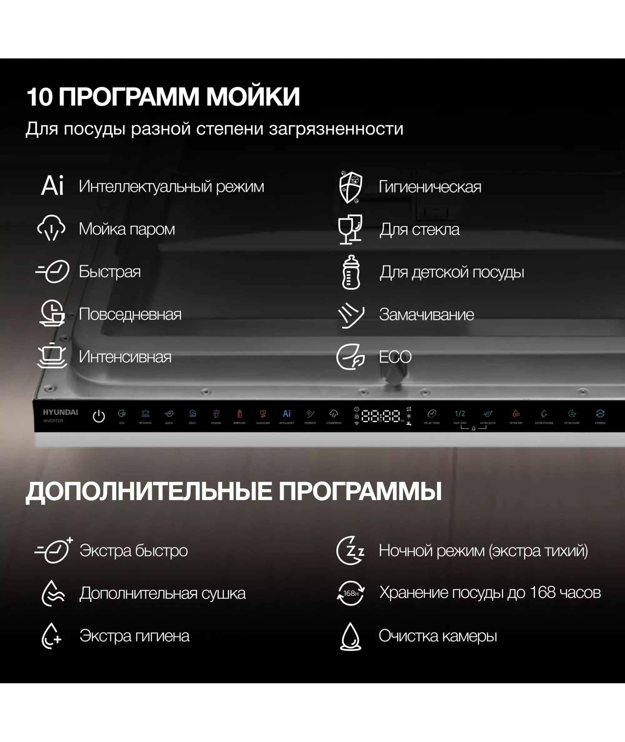 | Программы | Интеллектуальный режим, Мойка паром, Быстрая, Повседневная, Интенсивная, Гигиеническая, Стекло, Детская посуда, Замачивание, ECO |