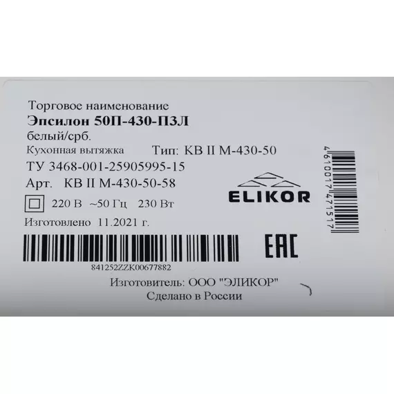 Вытяжка ELIKOR Эпсилон 50П-430-П3Л белый/серебристый управление: ползунковое (1 мотор) [841252]