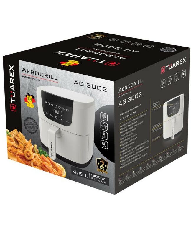 - Аэрогриль Tuarex AG-3002 предназначен для приготовления блюд с эффектом фритюра и гриля. Данная модель обеспечивает равномерную прожарку и делает блюда вкусными и с хрустящей корочкой. Блюда получаются золотистыми и сочными