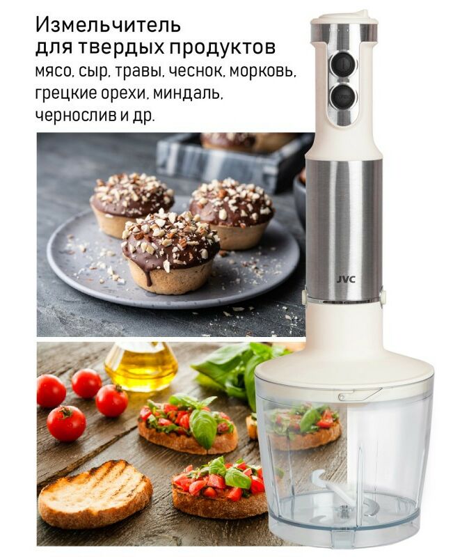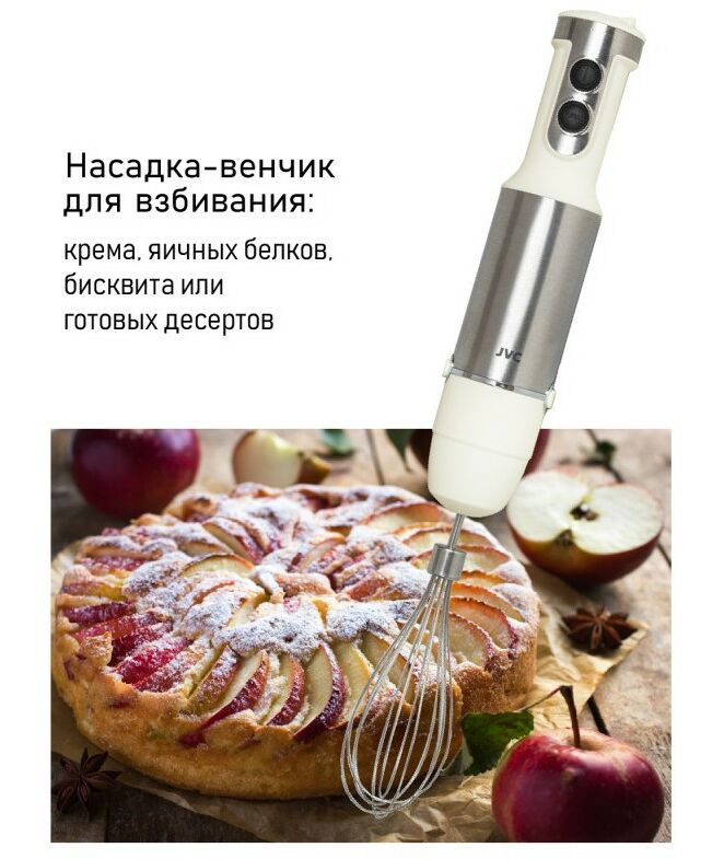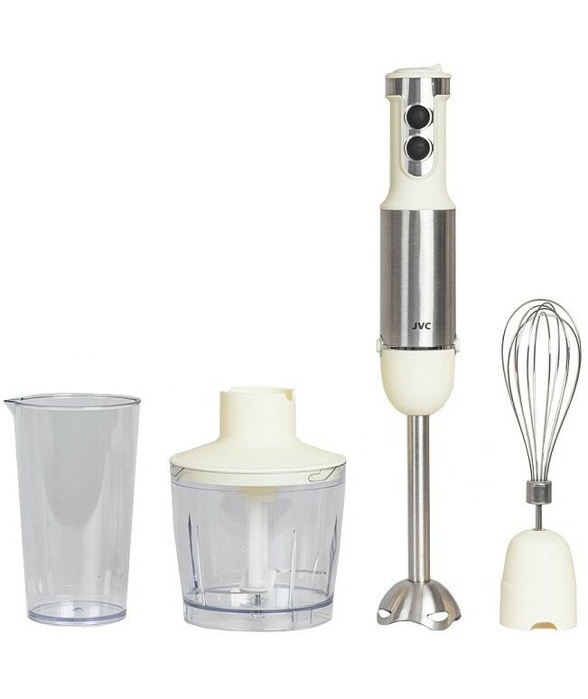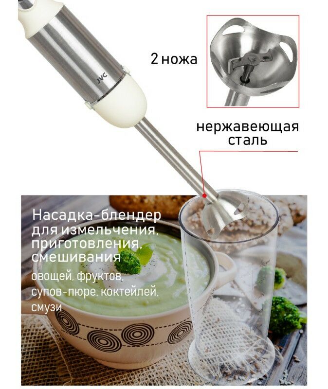 - Насадки: съемная насадка-блендер с двойным лезвием из нержавеющей стали, съемная насадка-венчик из нержавеющей стали