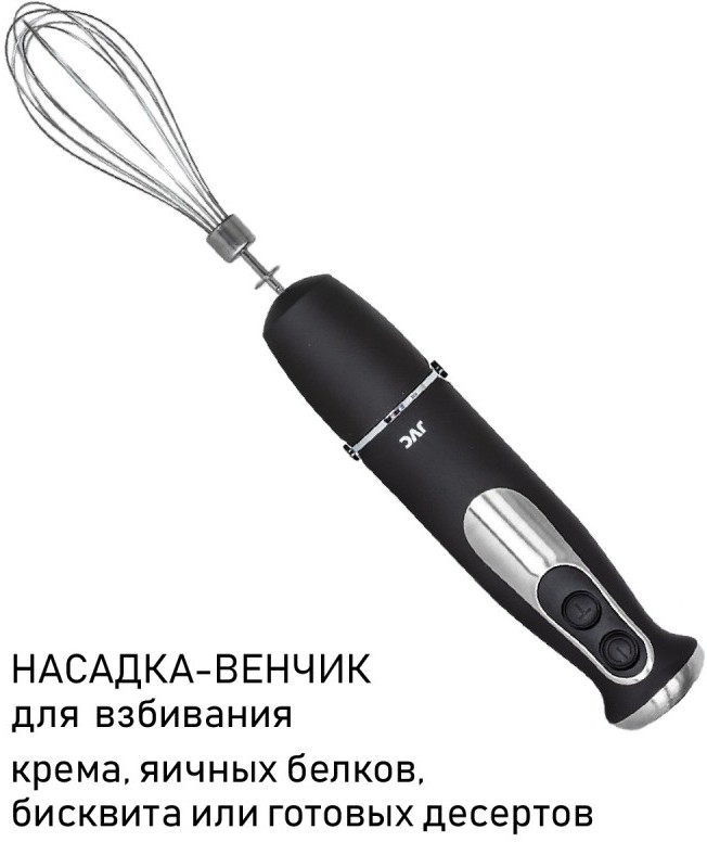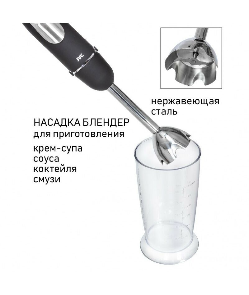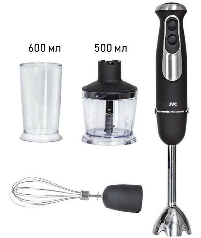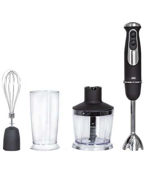 - Многофункциональный погружной блендер JVC JK-HB5123 c измельчителем и 2 насадками поможет в приготовлении супов, соусов, выпечки и десертов, зимних заготовок и других ваших любимых блюд