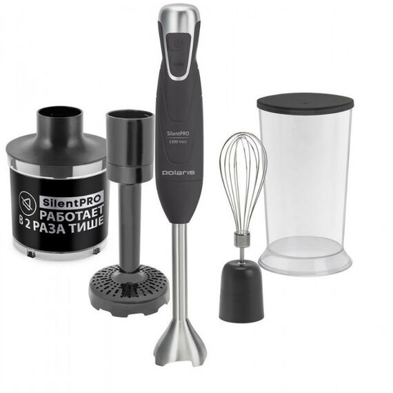 Блендер ручной Polaris PHB 1380 Silent объем чаши 500 мл, мощность 1300 Вт, скоростные режимы 2, количество приборов 4 в 1: измельчитель, блендер, миксер + насадка для пюре, цвет серый
