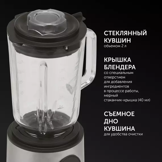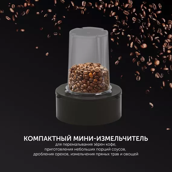 | Другие насадки | Съемный кувшин из высокопрочного стекла объемом 2 л (полезный объём 1,5 л). Компактный мини-измельчитель для перемалывания зёрен кофе, приготовления небольших порций соусов, дробления орехов, измельчения пряных трав и овощей. |
