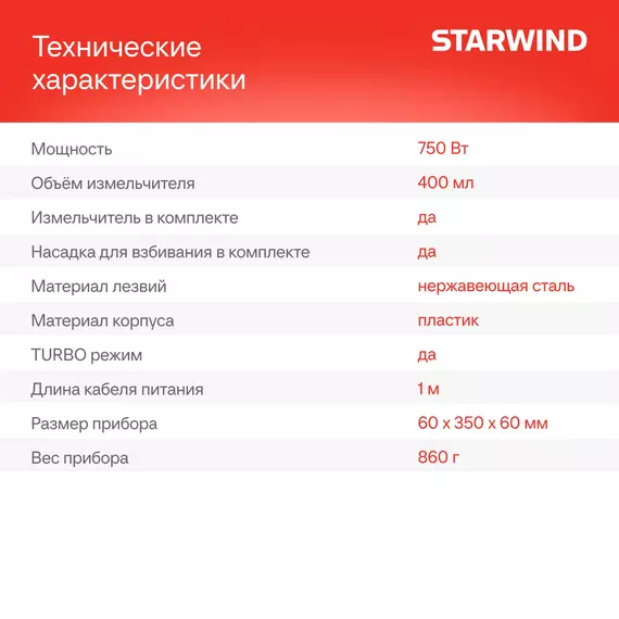 Блендер погружной STARWIND SBP1111 750Вт белый