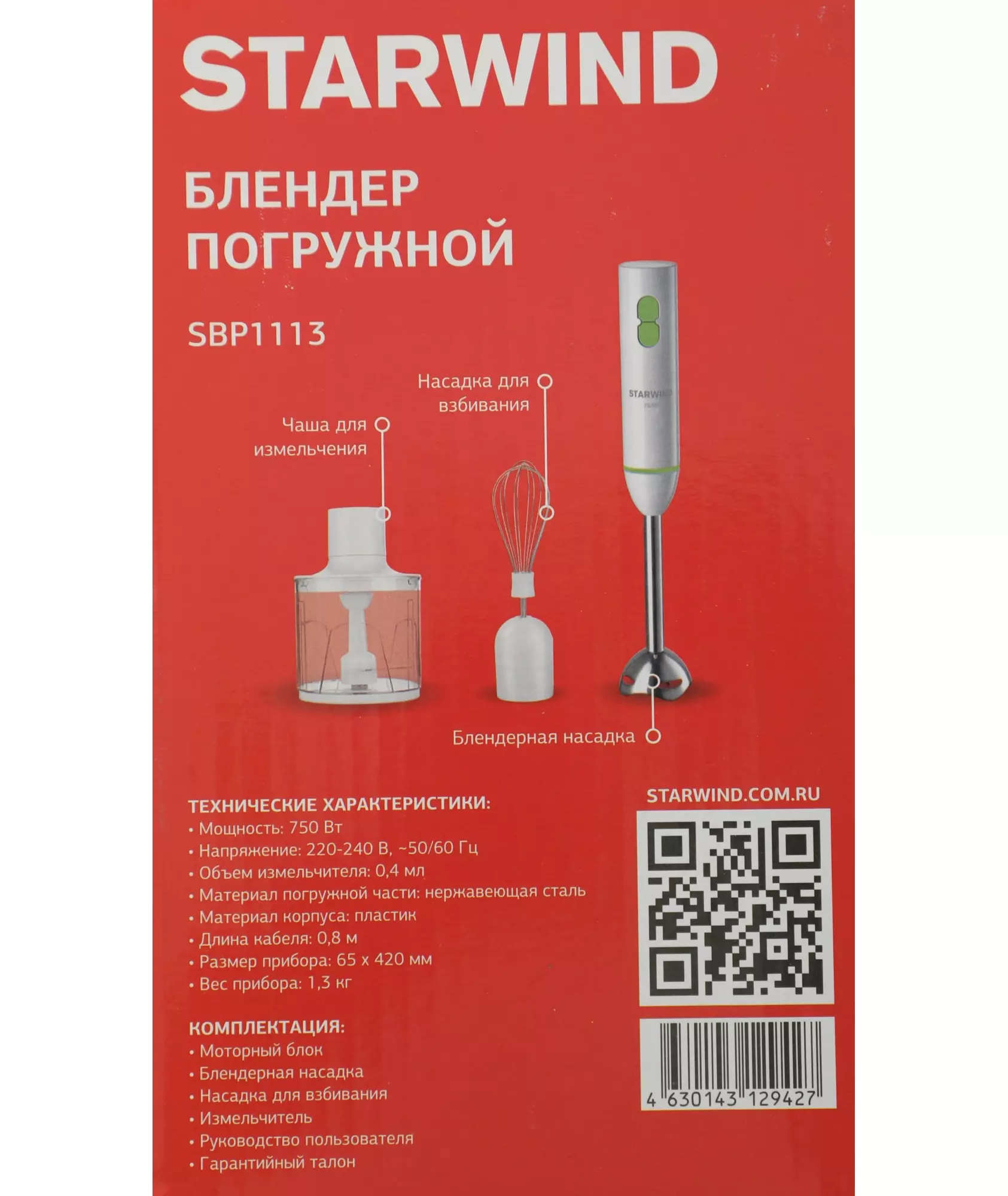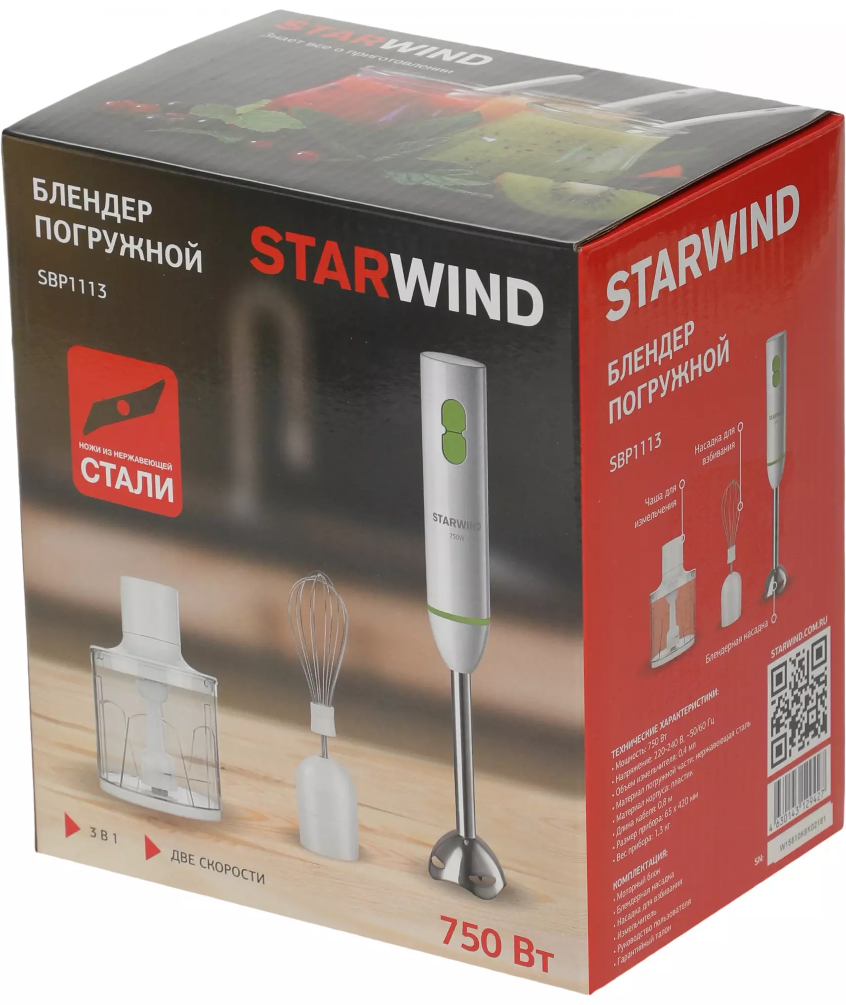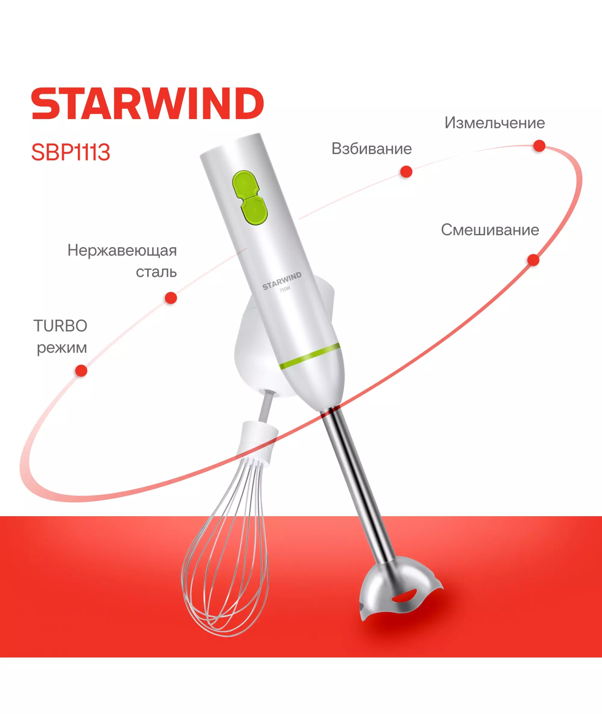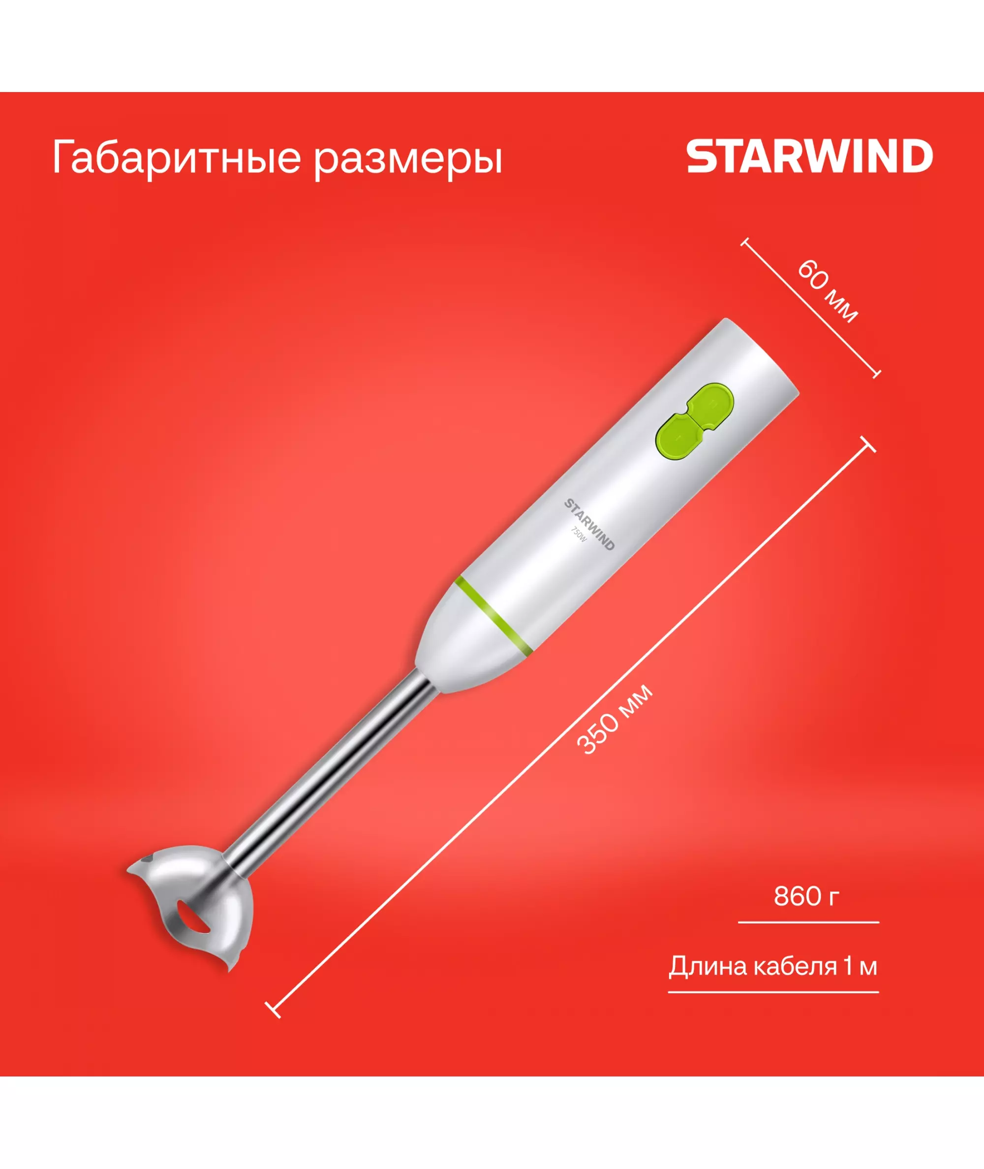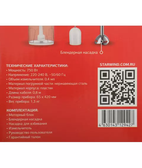 Блендер STARWIND SBP1113 погружной 750Вт белый/зеленый