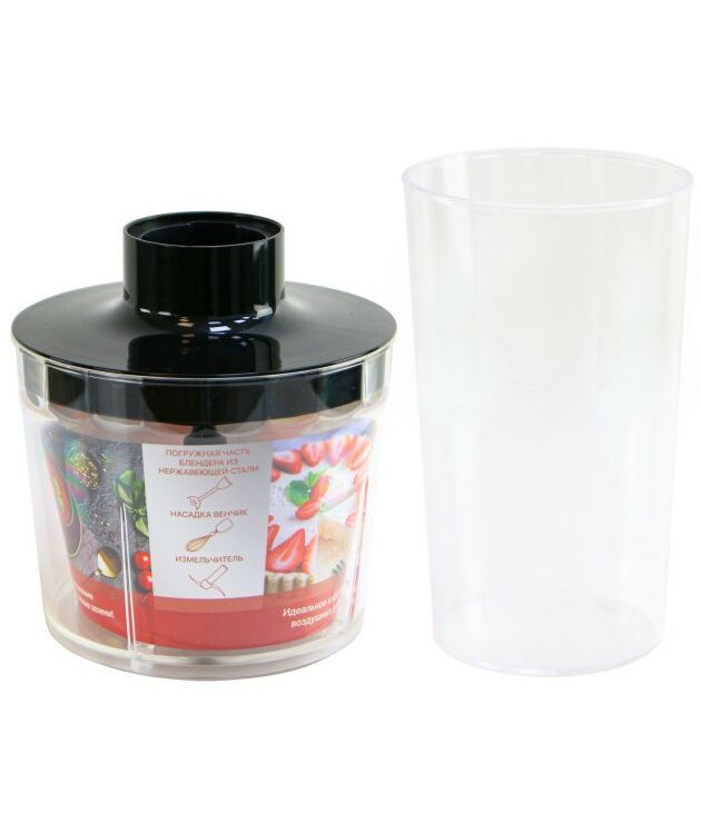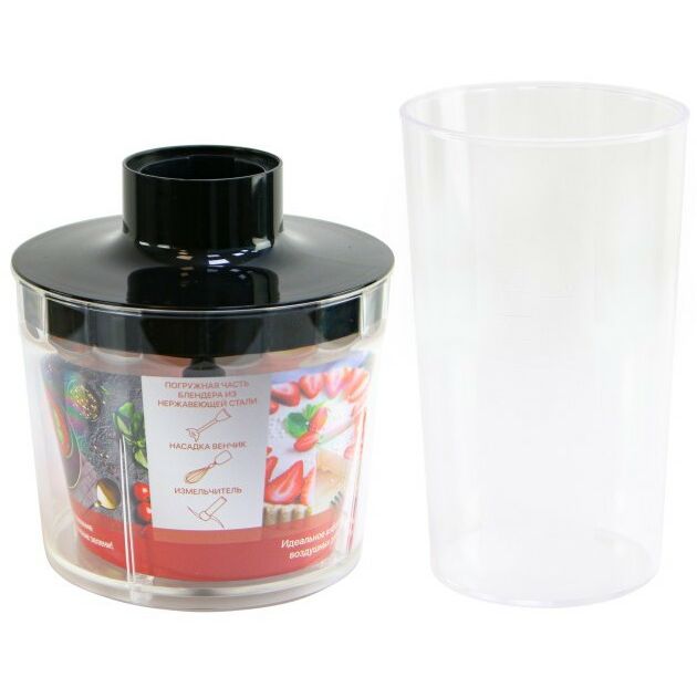 - В комплект к изделию входит стальная насадка измельчитель твёрдых продуктов – зелени, орехов или овощей, венчик для взбивания яичных белков, сливок, десертов и пластиковый стакан с мерной шкалой до 600 мл