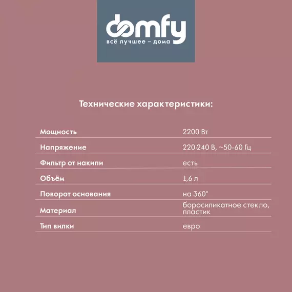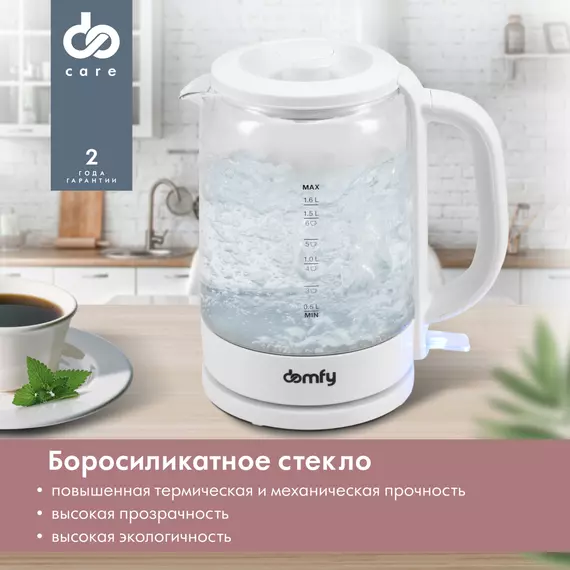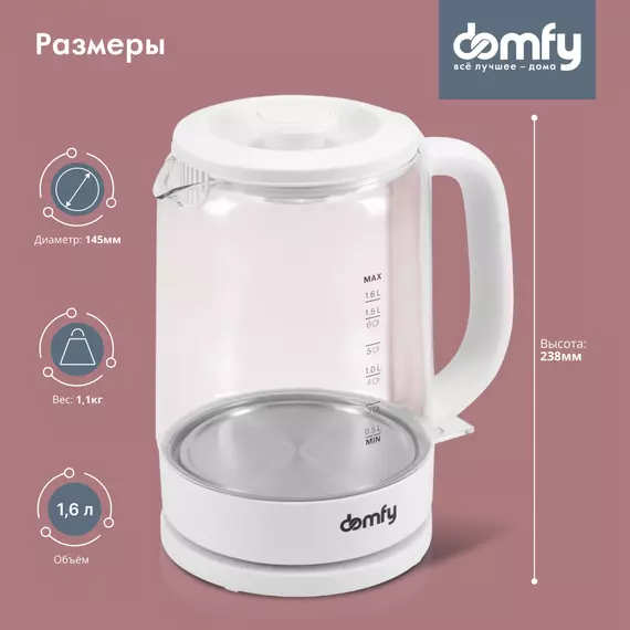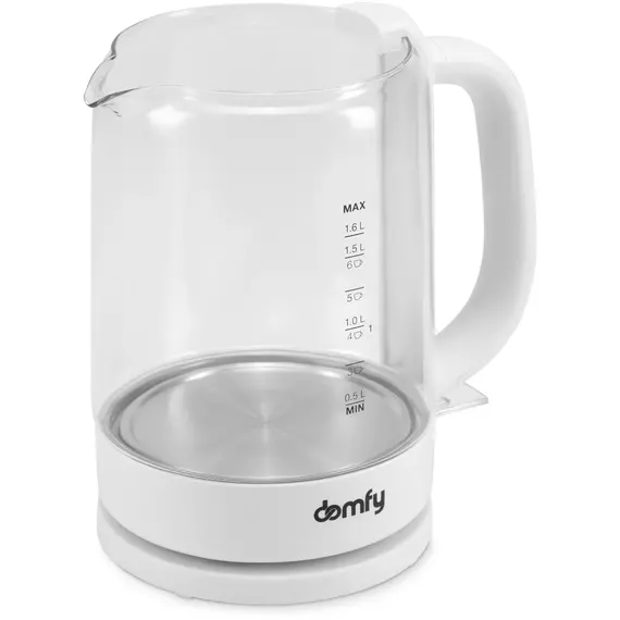 Компактный и легкий стеклянный электрический чайник DOMFY DSW-EK304 объемом 1,6 литра является образцом сочетания практичности и доступности. Эта модель изготовлена из материалов, обладающих высокой стойкостью к механическим и термическим воздействиям, проста в эксплуатации и не займет много места на кухне.