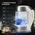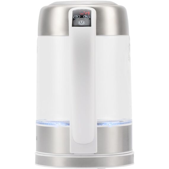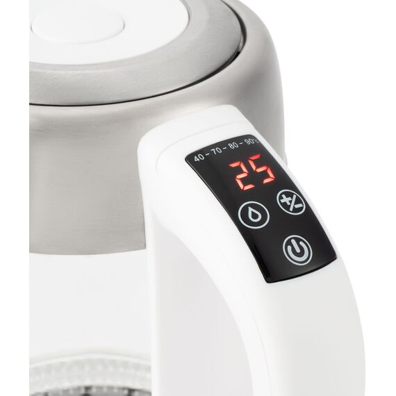 Полный объём чайника составляет 1700 мл, которые быстро нагреваются от 2200 Вт предусмотренной в нём мощности. Девайс имеет целых пять различных температурных режимов, подходящих для разных видов чаёв и других напитков, чувствительных к уровню нагрева: 40 градусов – для детского питания, 70 – для улуна, 80 – для зелёного чая, 90 – для чёрного чая, 100 – для пуэра. Они переключаются на рукоятке прибора, при помощи сенсорных кнопок и яркого LED-дисплея, а умная подсветка подскажет, насколько горячая вода в данный момент времени.