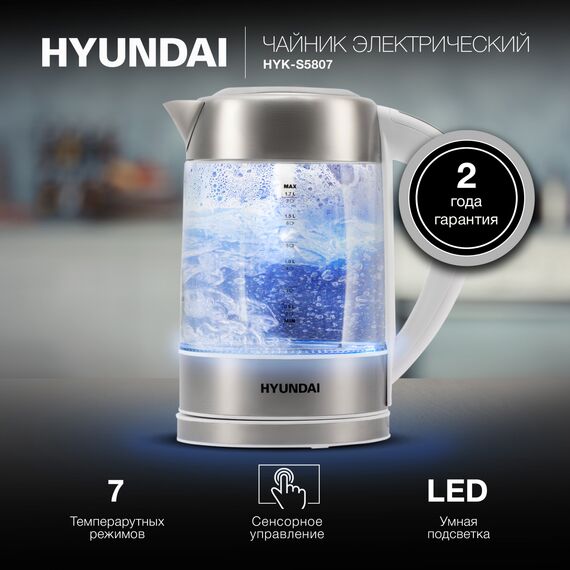 Корпус данной модели изготовлен из стекла. Оно не только красиво пропускает подсветку, когда Hyundai HYK-S5807 работает, но также отлично поддерживает воду тёплой в течение долгого времени.