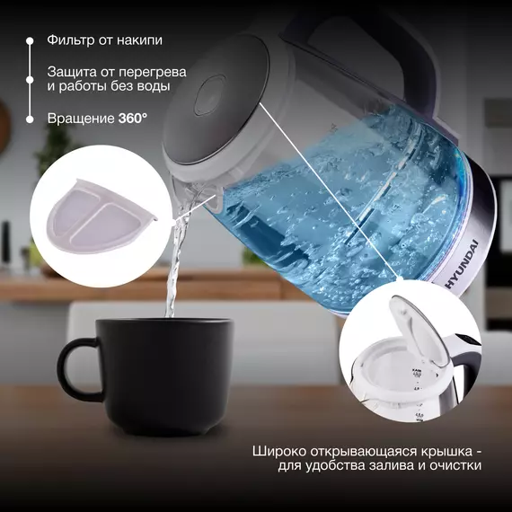 | Конструктивные особенности | кнопка открытия крышки, подсветка воды, подставка 360, фильтр от накипи |