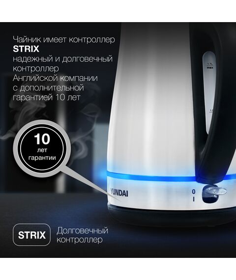 | Особенности | Чайник имеет контроллер STRIX – надежный и долговечный контроллер Английской компании с дополнительной гарантией 10 лет. Корпус выполнен из аустенитной стали SUS304 с повышенной стойкости к окислению и коррозии. Яркая и красивая LED подсветка оповещает о работе. 2 года гарантии. |