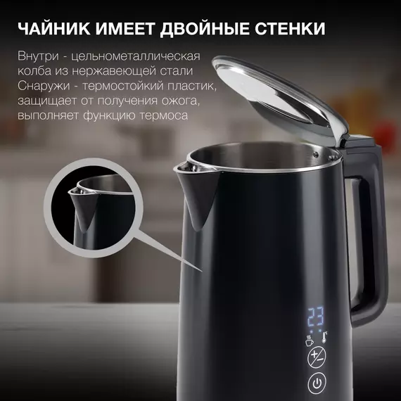| Особенности | Двойной теплоизолированный корпус. Внешний корпус из термостойкого пластика, защищает от случайного ожога при прикосновении. Внутренний корпус из нержавеющей стали, не впитывает и не выделяет примесей. Эффект термоса - температура воды в чайнике дольше остается теплой. |