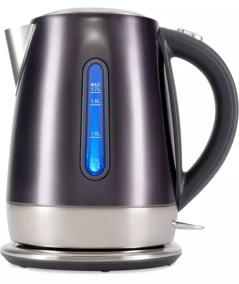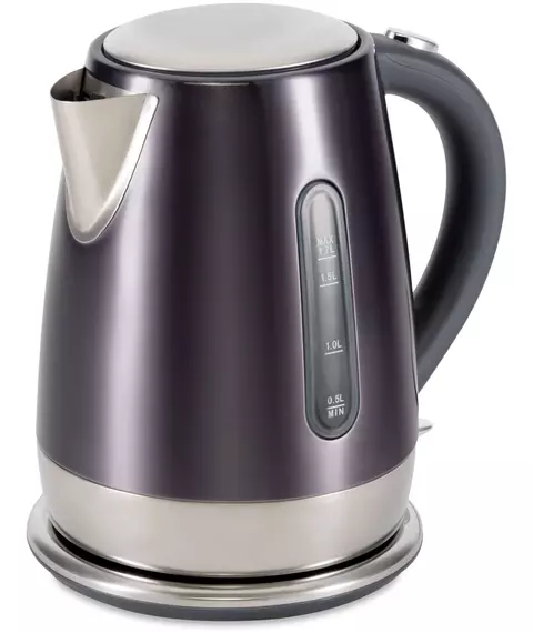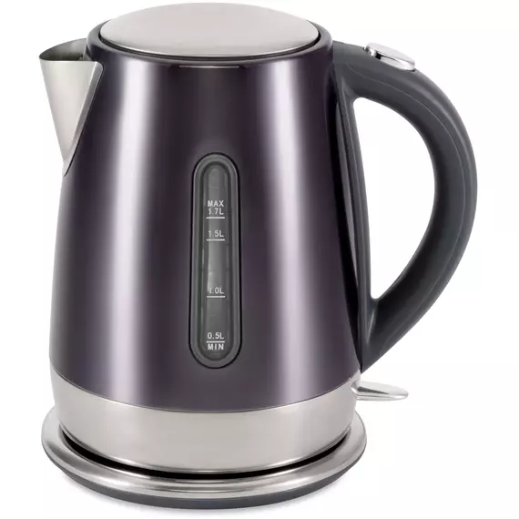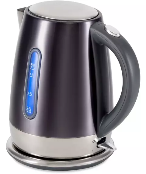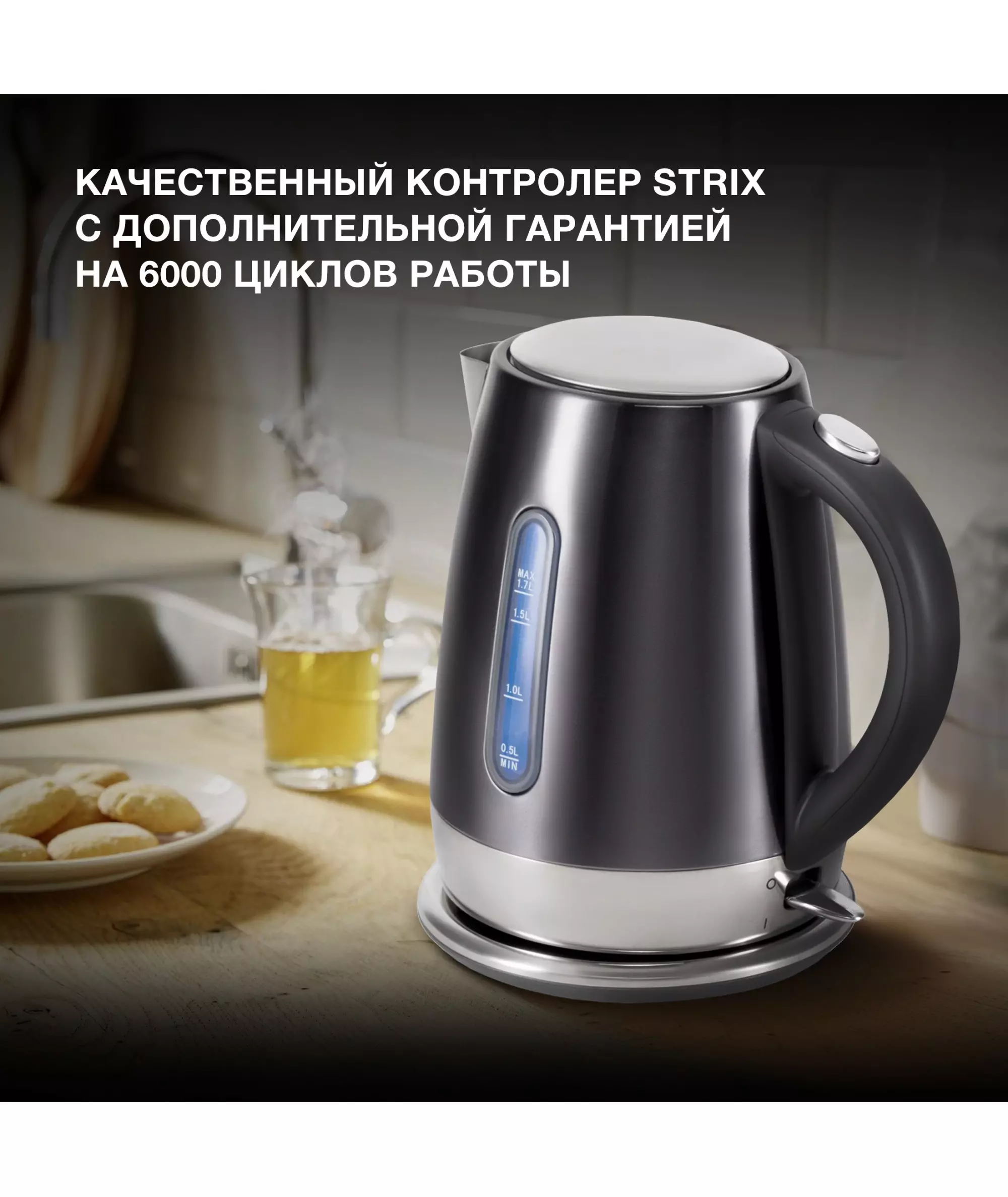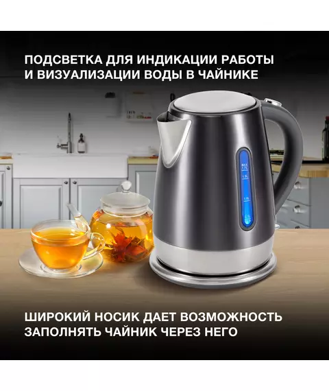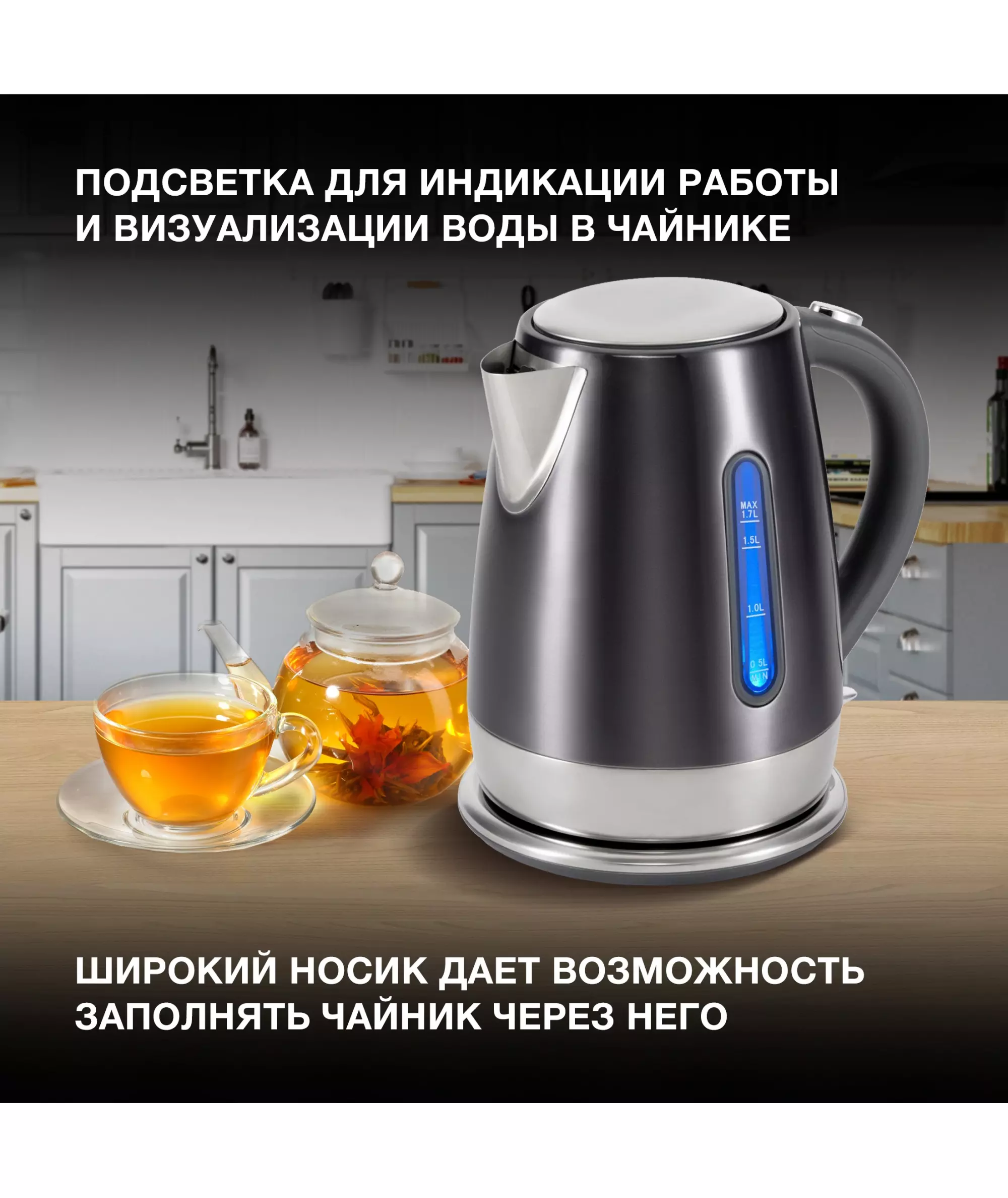 Стильный металлически чайник в трендовом графитовом цвете. Качественная сборка, эргономичная форма, хромированные элементы, делают из чайники стильный и полезный аксессуар на кухне.