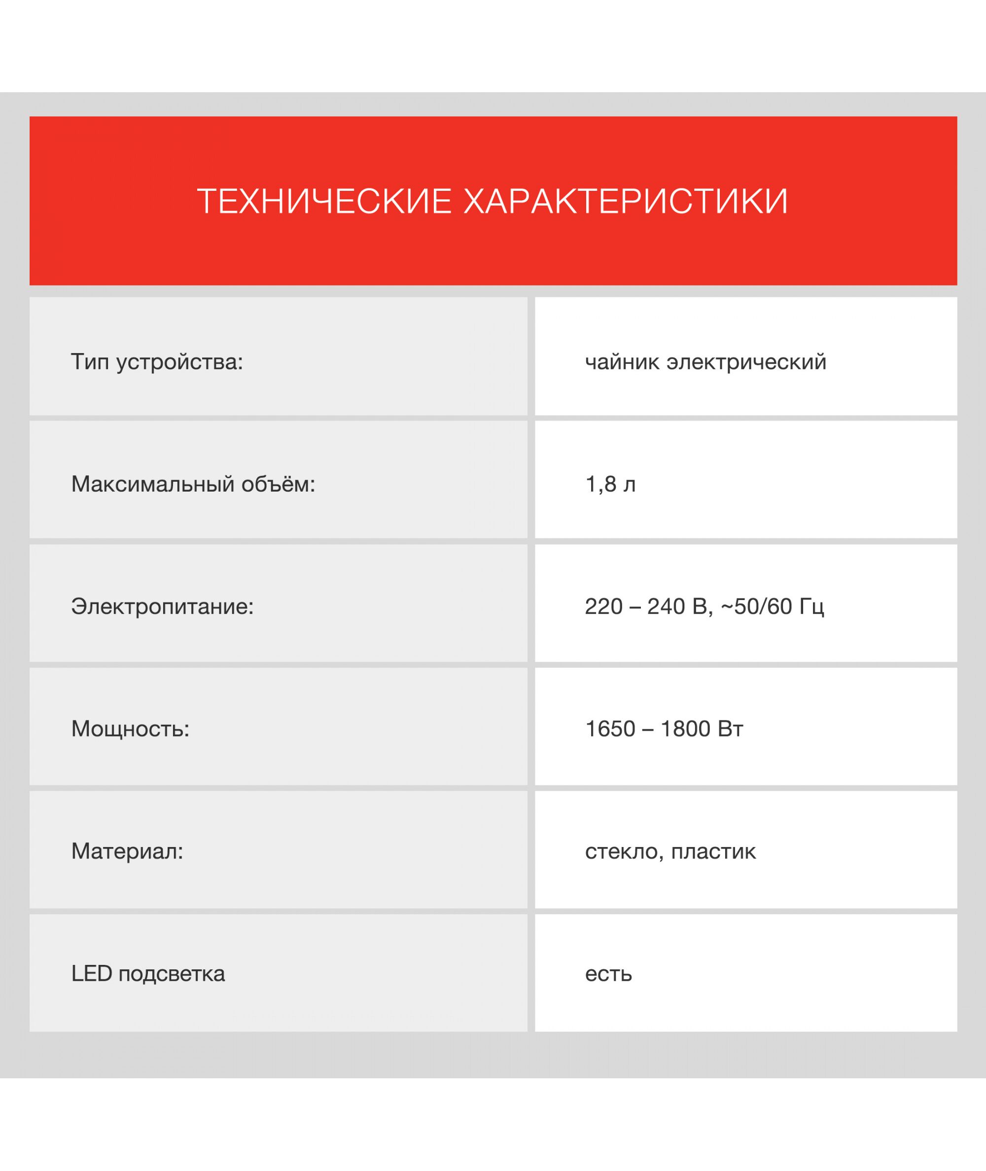 | Максимальный объем | 1.8 л |