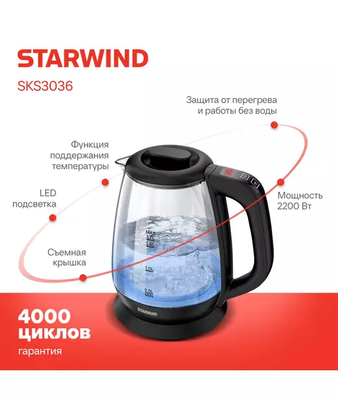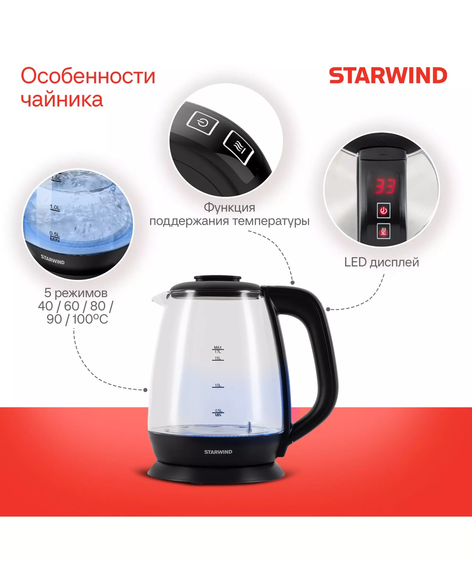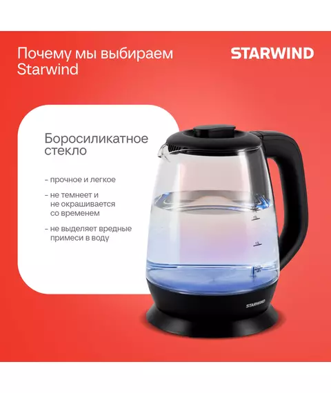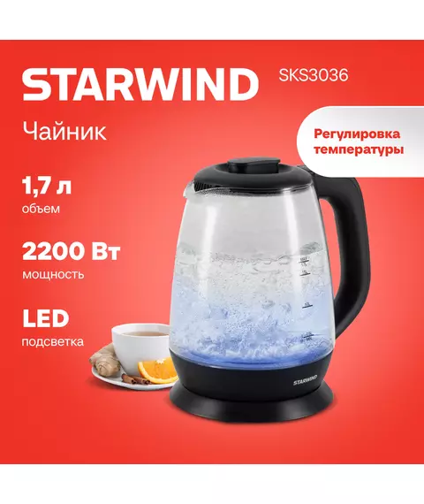 Чайник электрический STARWIND SKS3036 1.7л. 2200Вт черный корпус: стекло