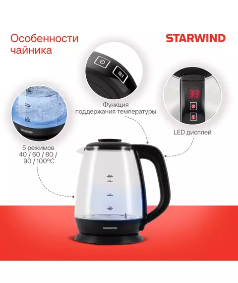| Особенности2 | Красивая LED подсветка украшает процесс закипания, является индикатором работы. Полностью съемная крышка для простоты залива и очистки чайника. |