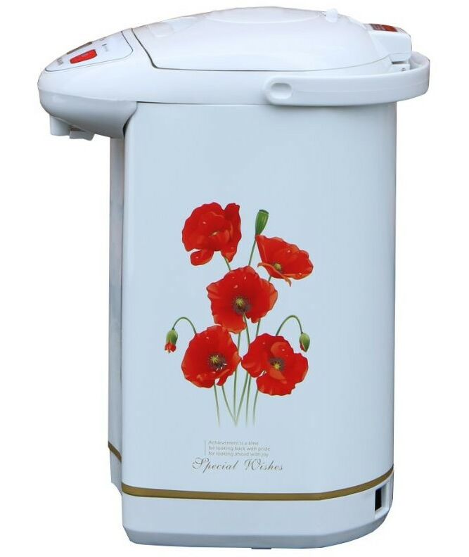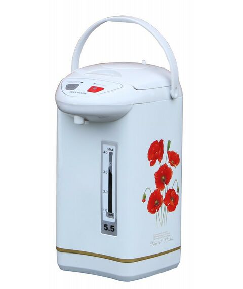 - Поттер имеет объем 5,5 литров, оснащен индикаторами уровня воды и нагрева, функцией поддержания температуры и защиты от перегрева