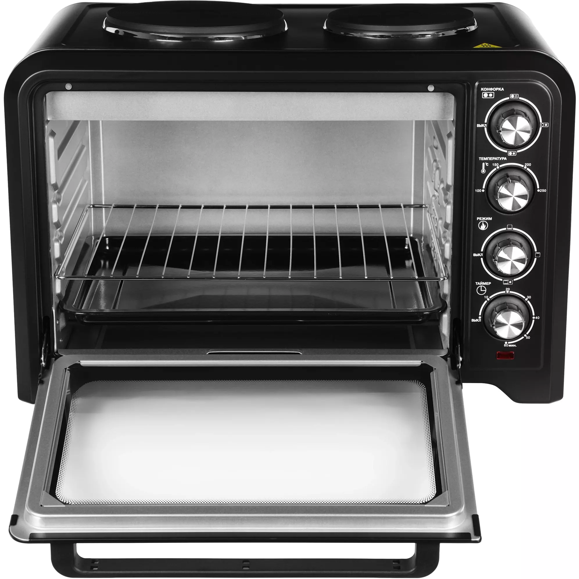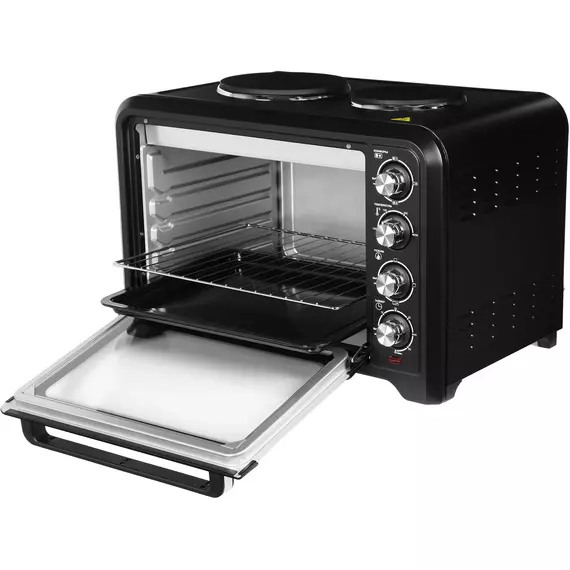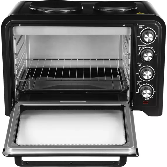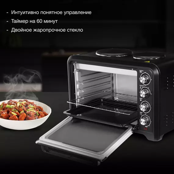 | Особенности | две конфорки 1000 Вт и 600 Вт, печь может работать одновременно как мини-печь, используя все функции, так и конфорки. Большая ручка из нержавеющей стали. |