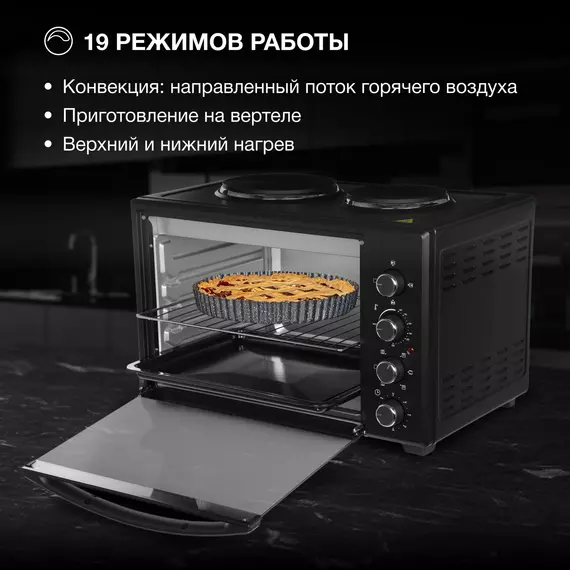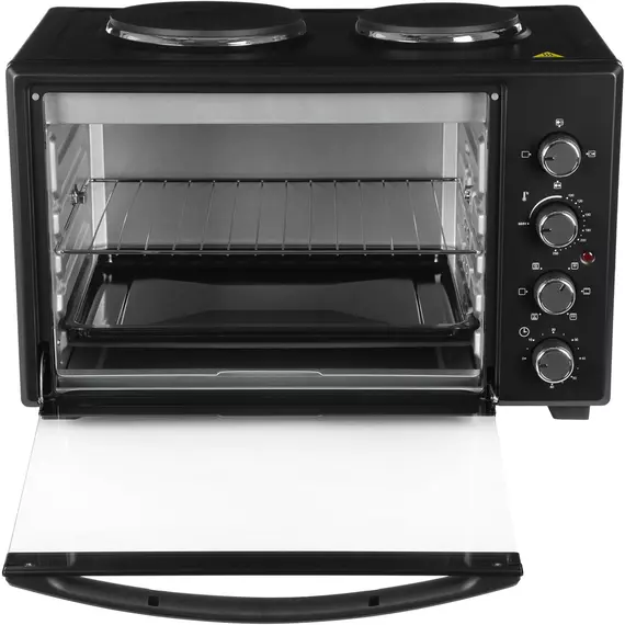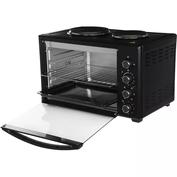 | Особенности | две конфорки 1000 Вт и 600 Вт, печь две конфорки 1000 Вт и 600 Вт, печь может работать одновременно как мини-печь, используя все функции, так и конфорки. Большая ручка из нержавеющей стали. |