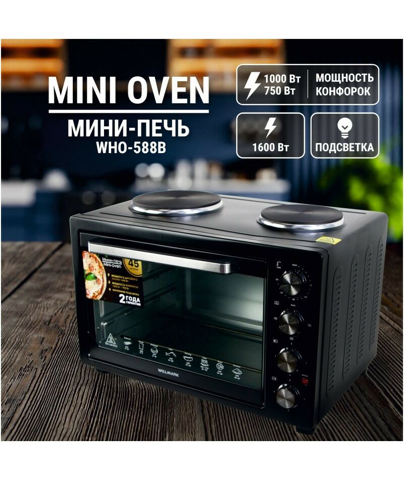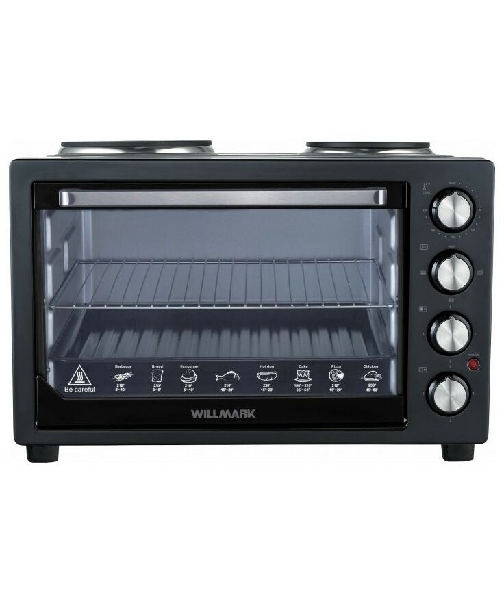 Духовка электрическая WILLMARK WHO-588B 45 литров, 2 конфорки, термостат, 230С, 2450Вт,черная
