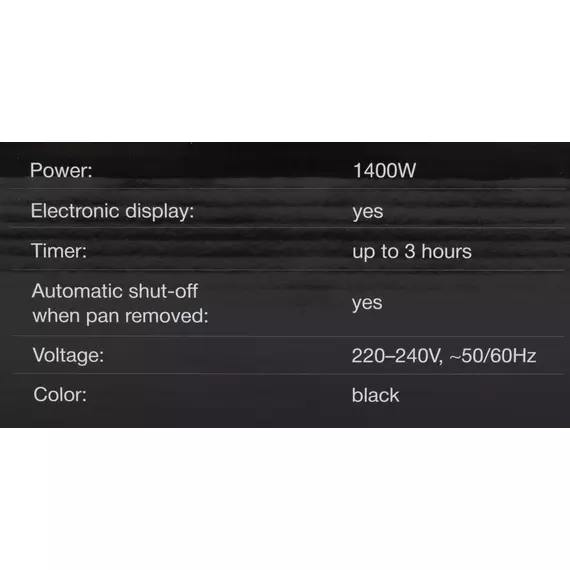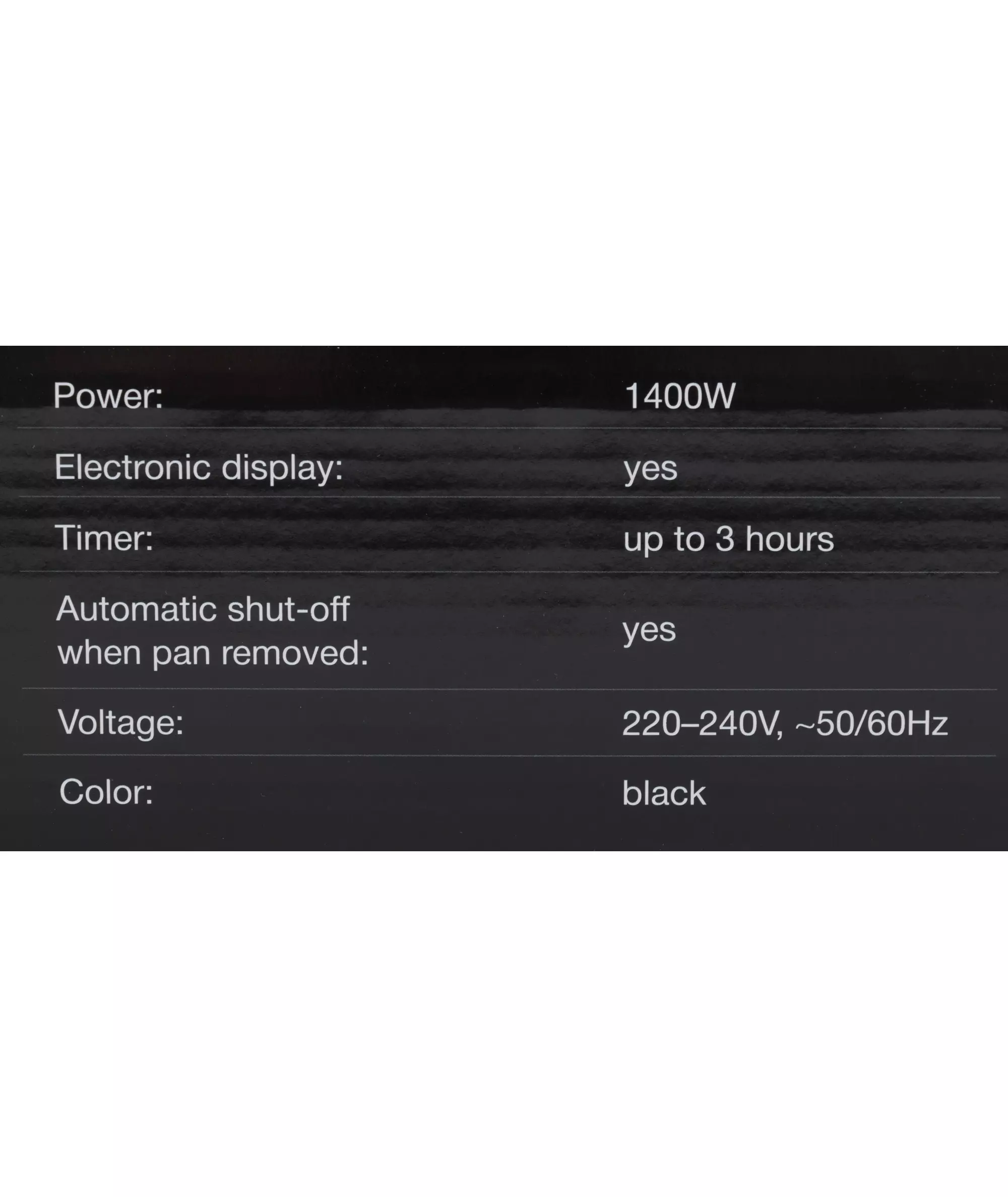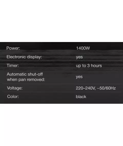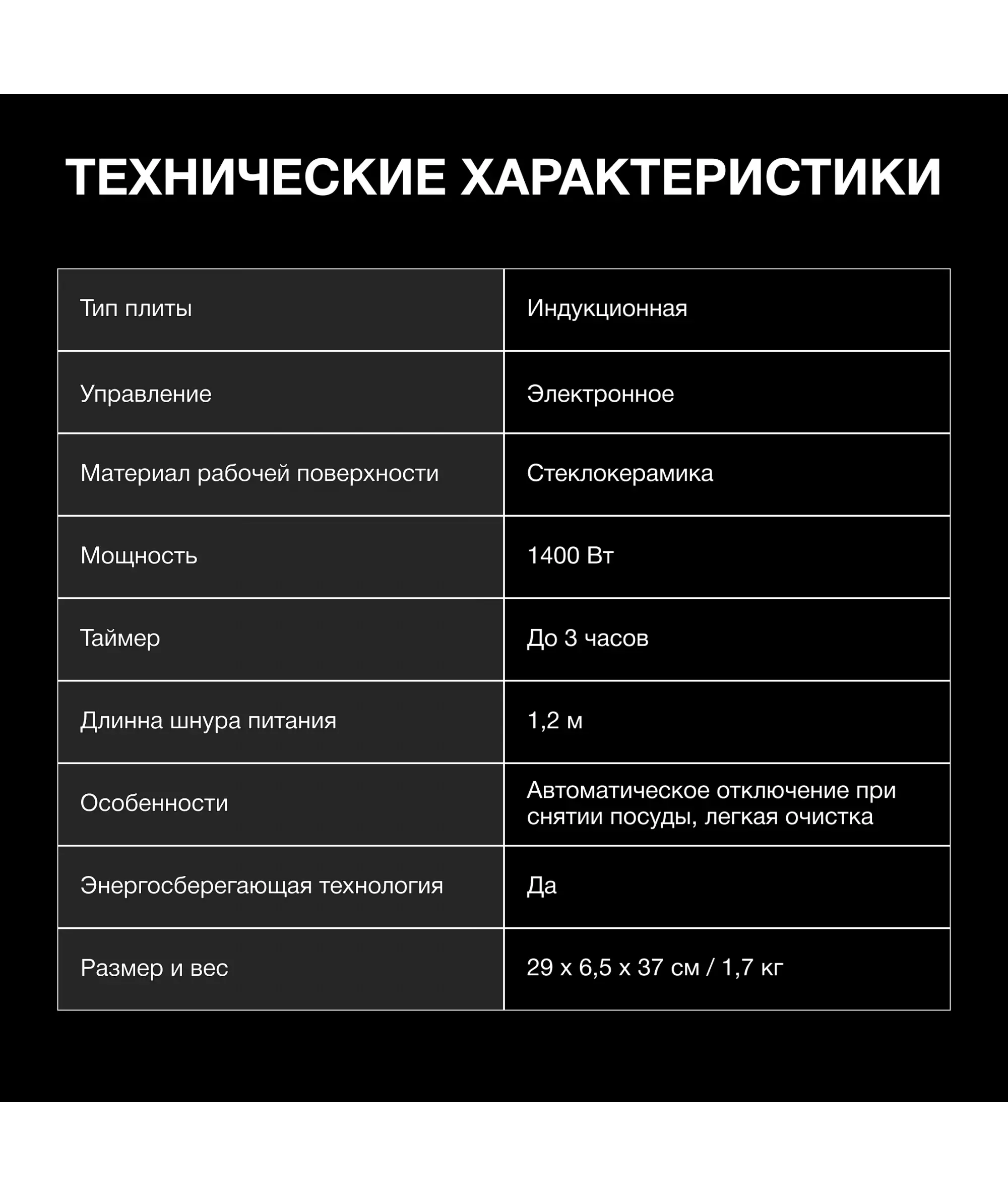 | Особенности | Автоматическое отключение при снятии посуды. Легкая очистка. Энергосберегающая технология. Таймер до 3 часов. |