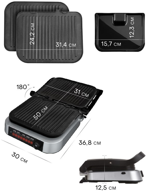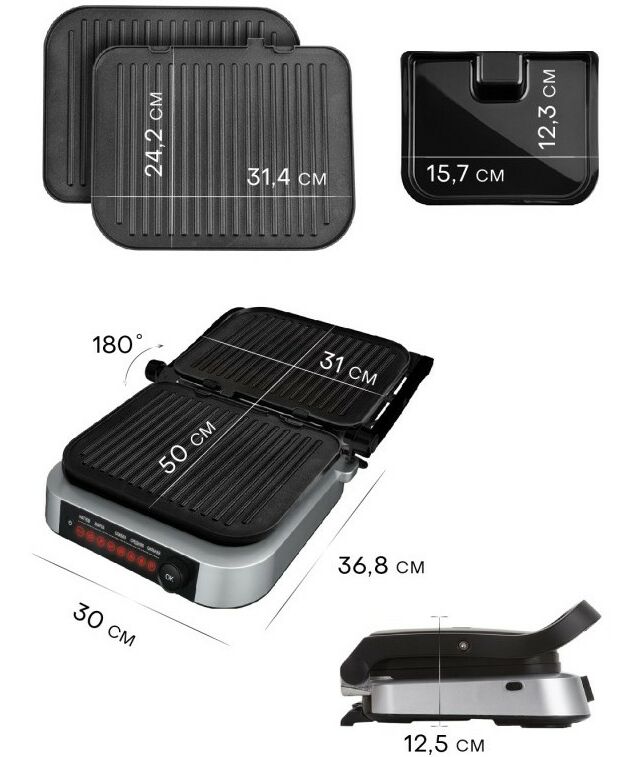 Электрический гриль, 2 съемный панели, поддон для сбора жира, гарантийный талон, инструкция на русском языке