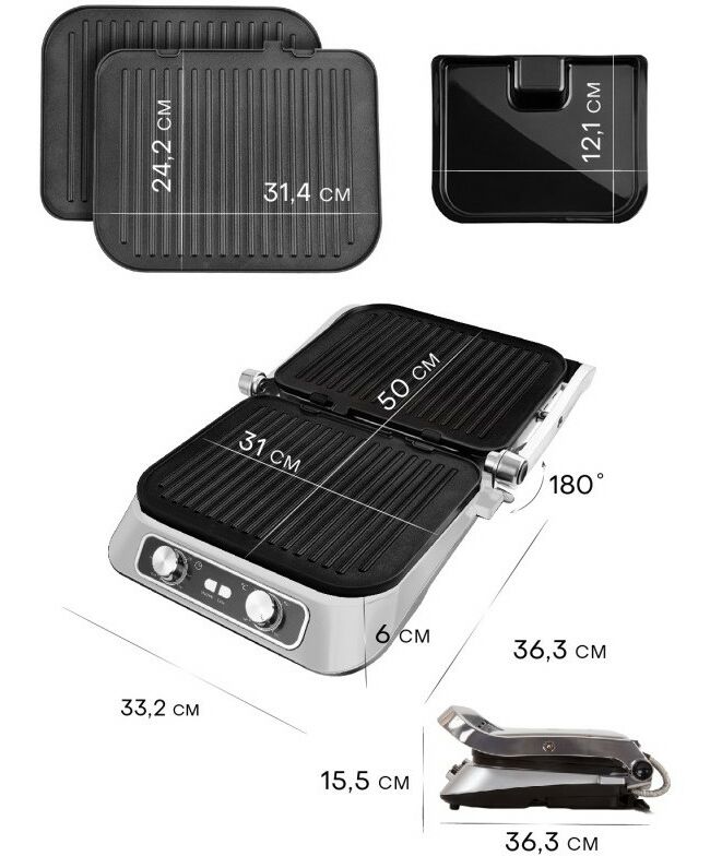 Электрический гриль, 2 съемный панели, поддон для сбора жира, гарантийный талон, инструкция на русском языке