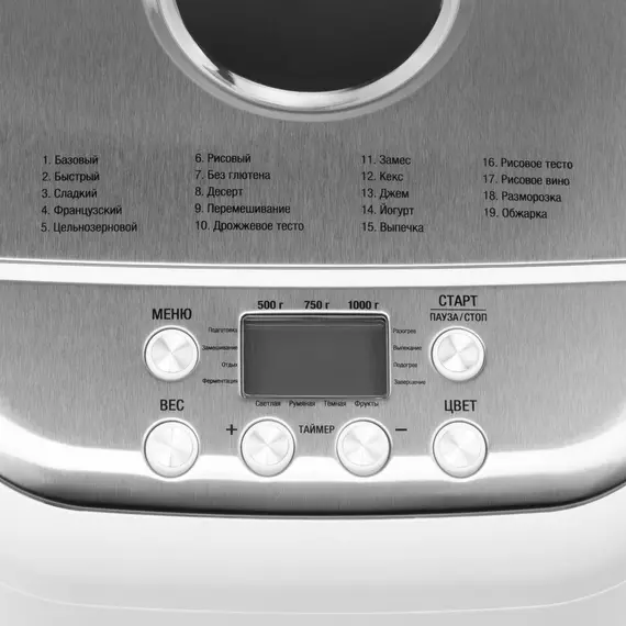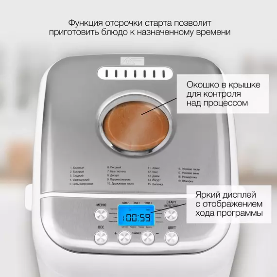 | Функции | выбор цвета корочки, поддержание температуры, таймер отсрочки старта |