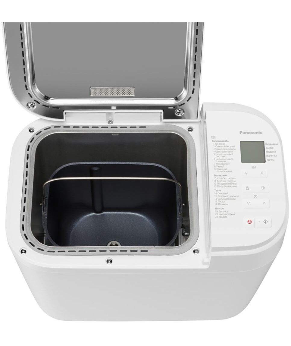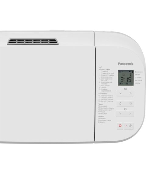 | Программы выпечки | Основной. Основной быстрый. Основной с изюмом. Цельнозерновой. Цельнозерновой быстрый. Цельнозерновой с изюмом. Французский. Ржаной. Основной бездрожжевой. Хлеб без глютена. Кекс без глютена. Пицца без глютена. Паста без глютена. Выпечка. Варенье/Джем. Фрукты в сиропе. |