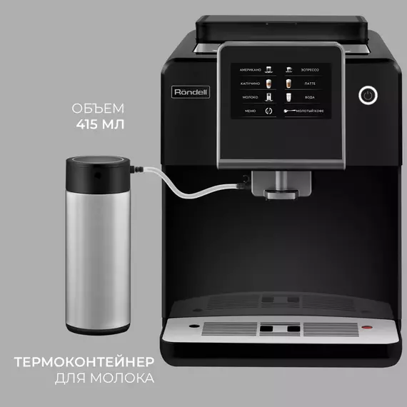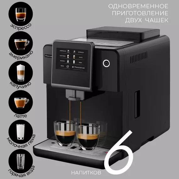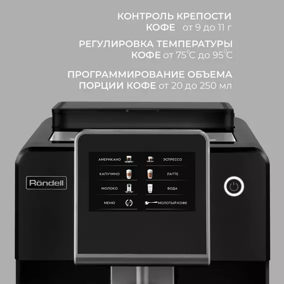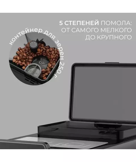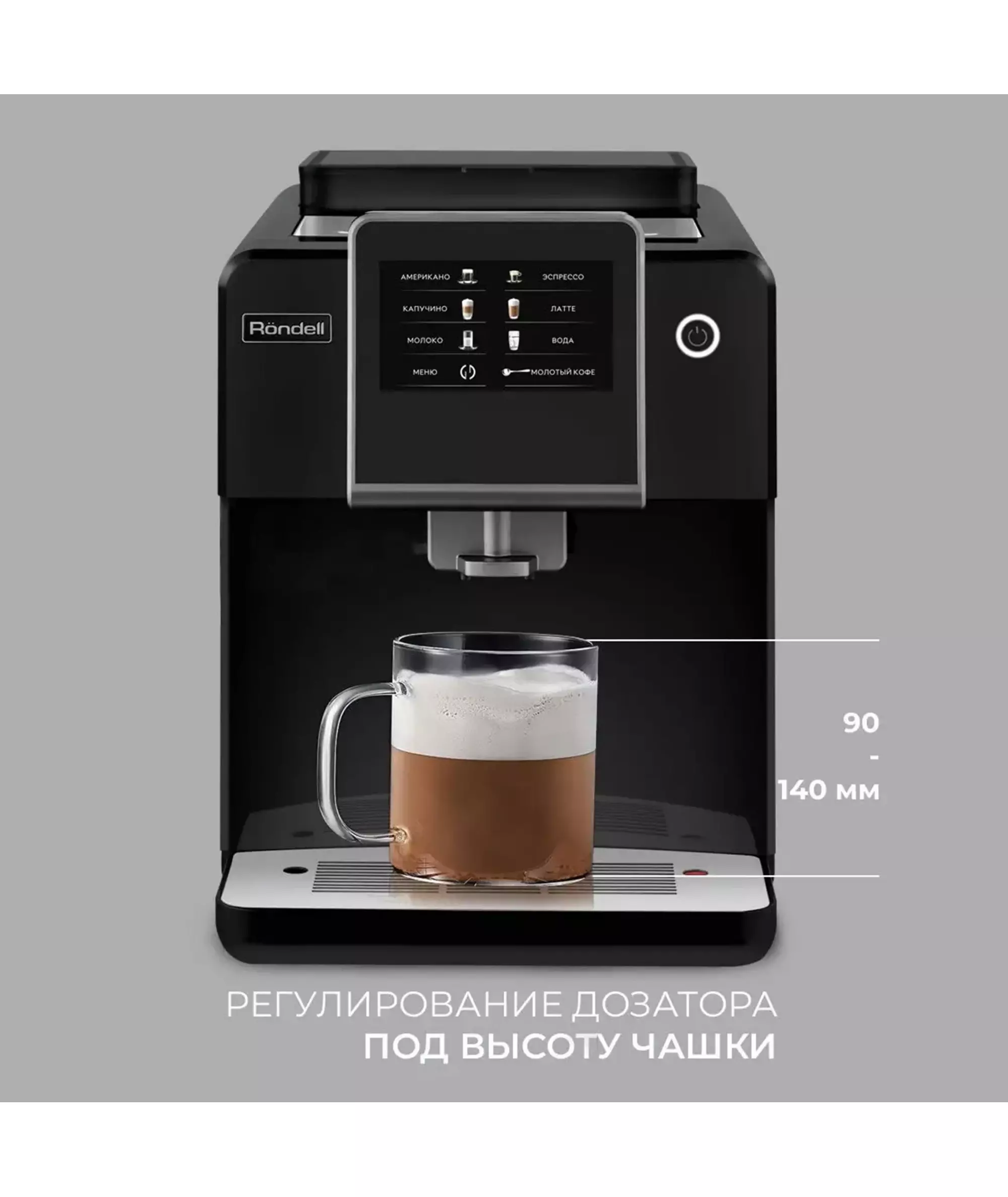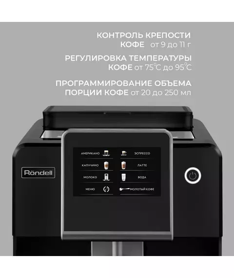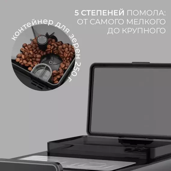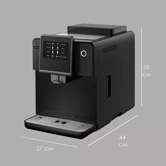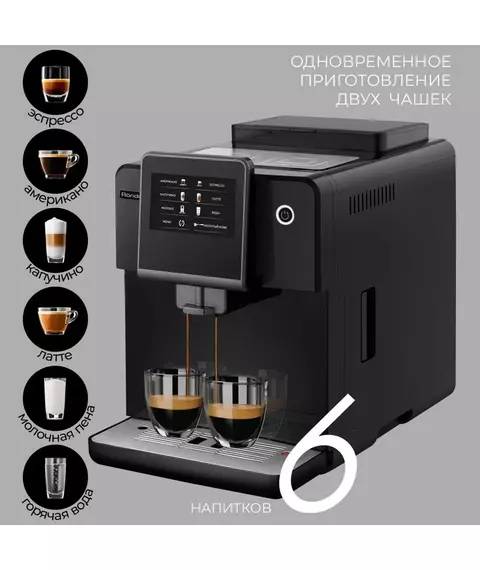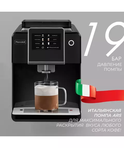 | Особенности | 5-дюймовый TFT-дисплей с сенсорным управлением. Итальянская помпа фирмы AET 19 бар. Профессиональная коническая кофемолка, 5 степеней помола. |