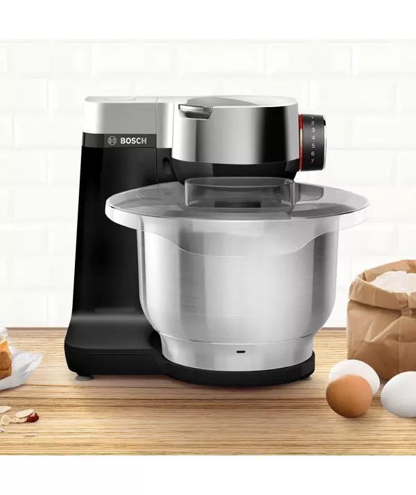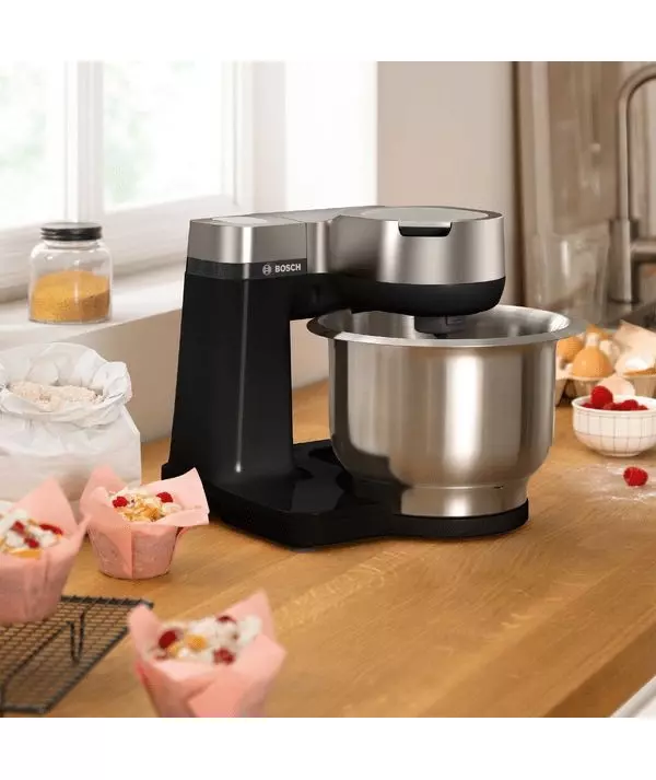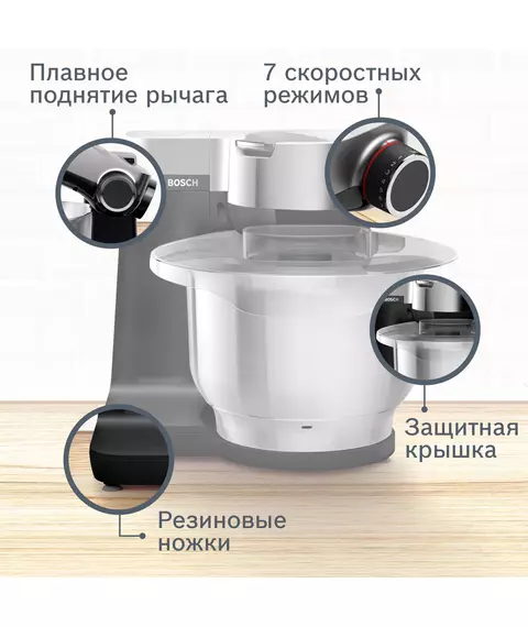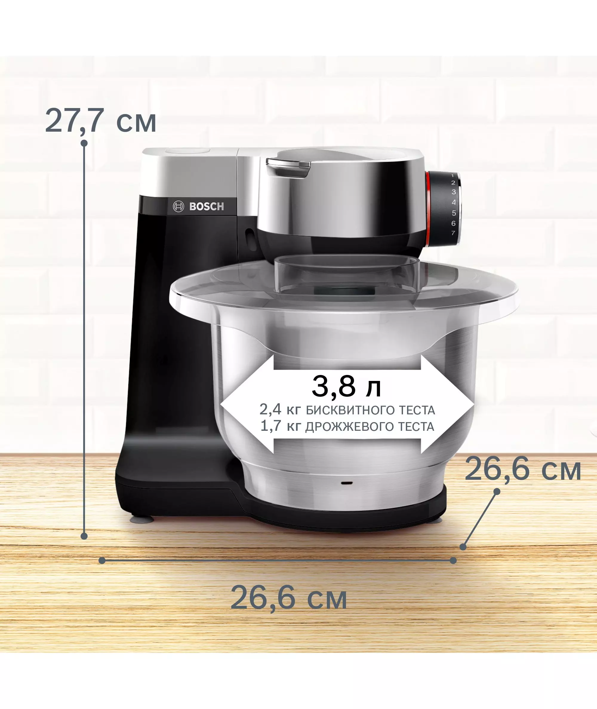 | Особенности чаши | Металлическая чаша 3.8 л: подходит для как для смешивания небольших объемов, так и для замеса до 2,4 кг бисквитного теста и 1,7 кг дрожжевого теста. |