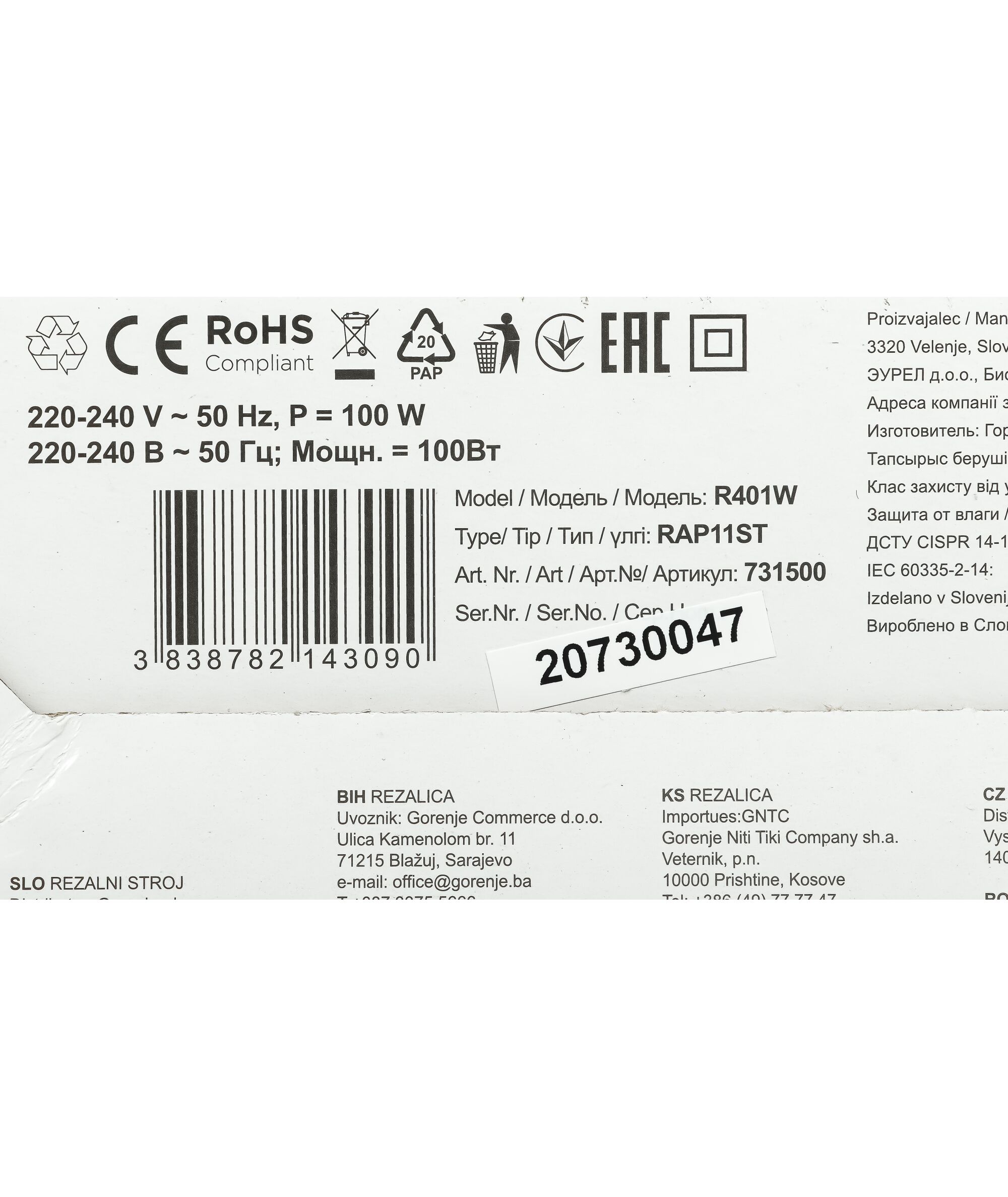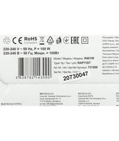 Ломтерезка Gorenje R401W 100Вт (нарезка до 17мм) белый