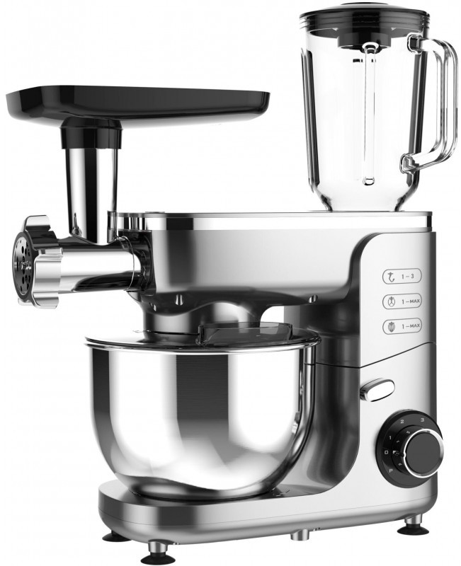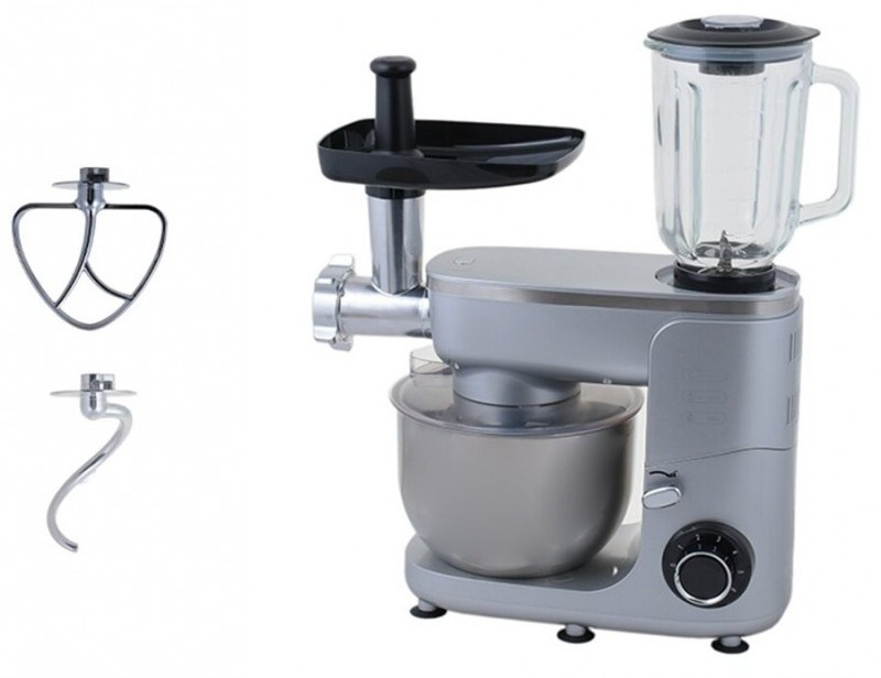 - Подробная комплектация: миксер, чаша 5 л, защитная крышка для чаши, насадка-венчик, насадка-крюк, насадка-лопатка, гарантийный талон, насадка-блендер, насадка-мясорубка, инструкция по эксплуатации