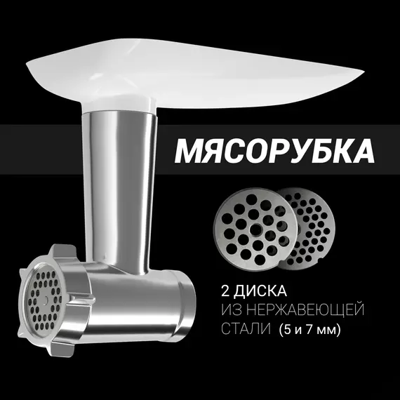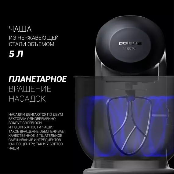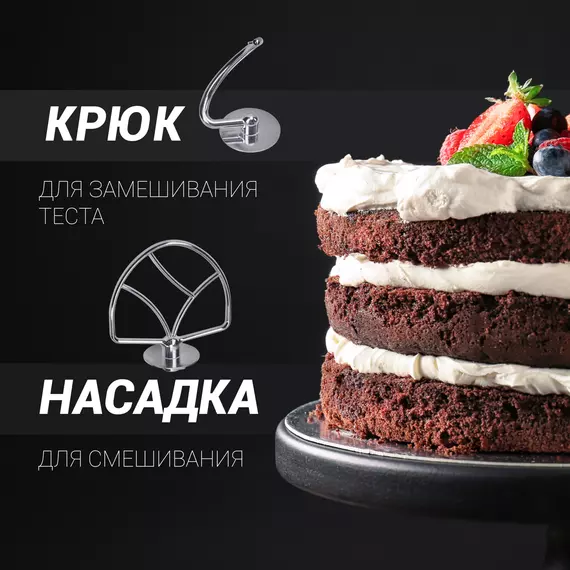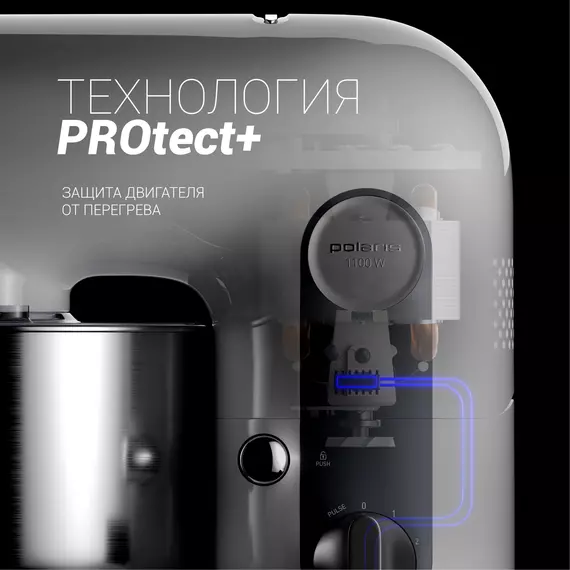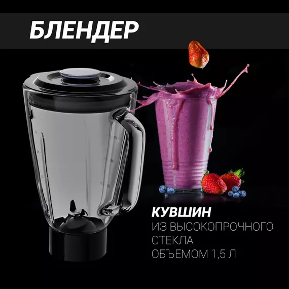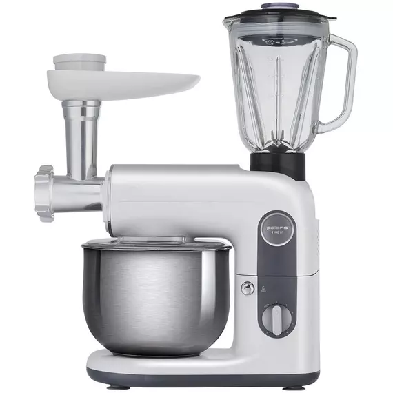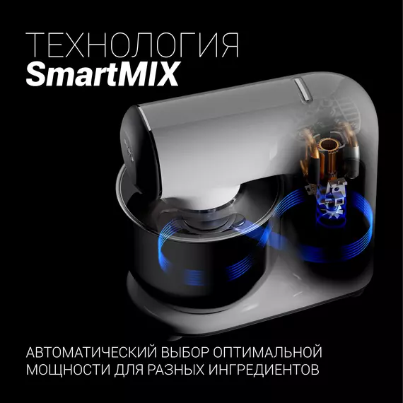 5 в 1: Планетарный миксер с 3-мя насадками, Блендер, Мясорубка. Технология SmartMIX - прибор автоматически подбирает оптимальную мощность работы для каждого вида и количества ингредиентов. Технология PROtect+ защита двигателя от перегрева.