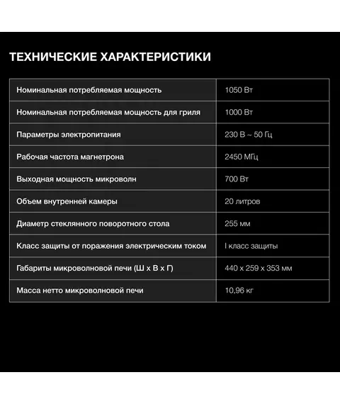| Дополнительные режимы | режим микроволны+гриль, ускоренный разогрев, экспресс-режим приготовления |