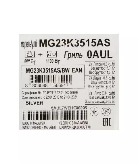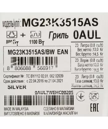 | Дополнительные режимы | поддержание температуры, режим микроволны+гриль, режим удаления запахов, ускоренная разморозка, ускоренный разогрев |