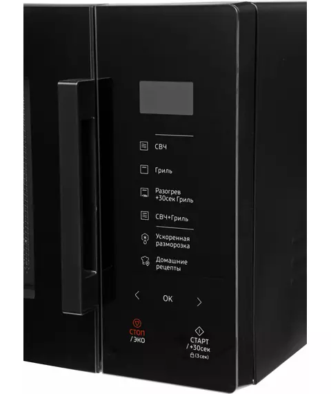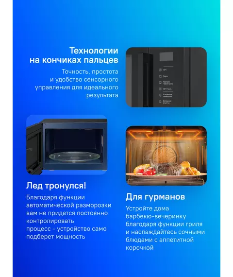 Микроволновая печь объёмом 23 литра, оснащённая мощным грилем. Она позволит приготовить супы, аппетитно подрумяненные овощи с мясом и тающую во рту выпечку. Кроме того, модель можно использовать для разогрева пищи и бережного размораживания полуфабрикатов.