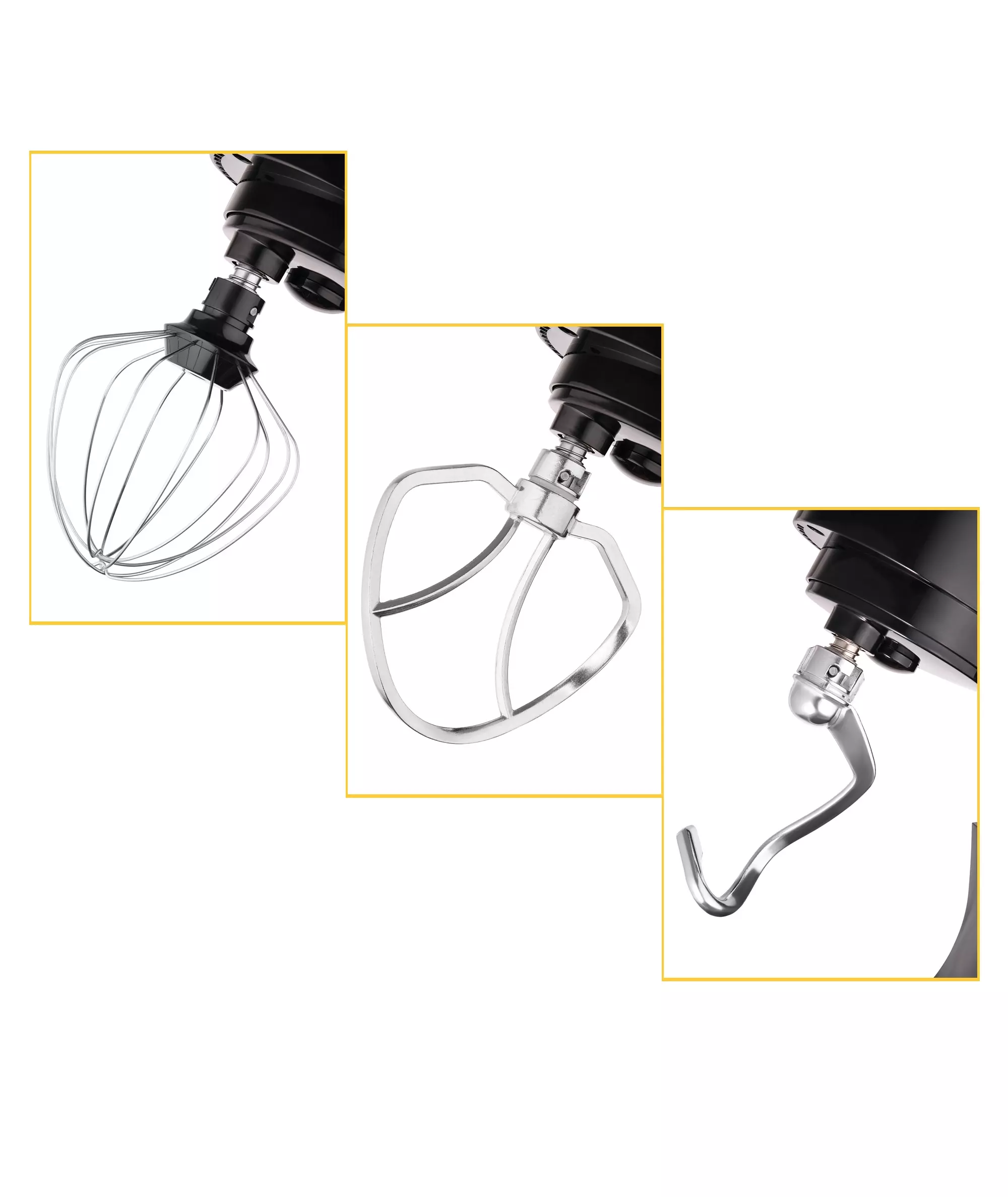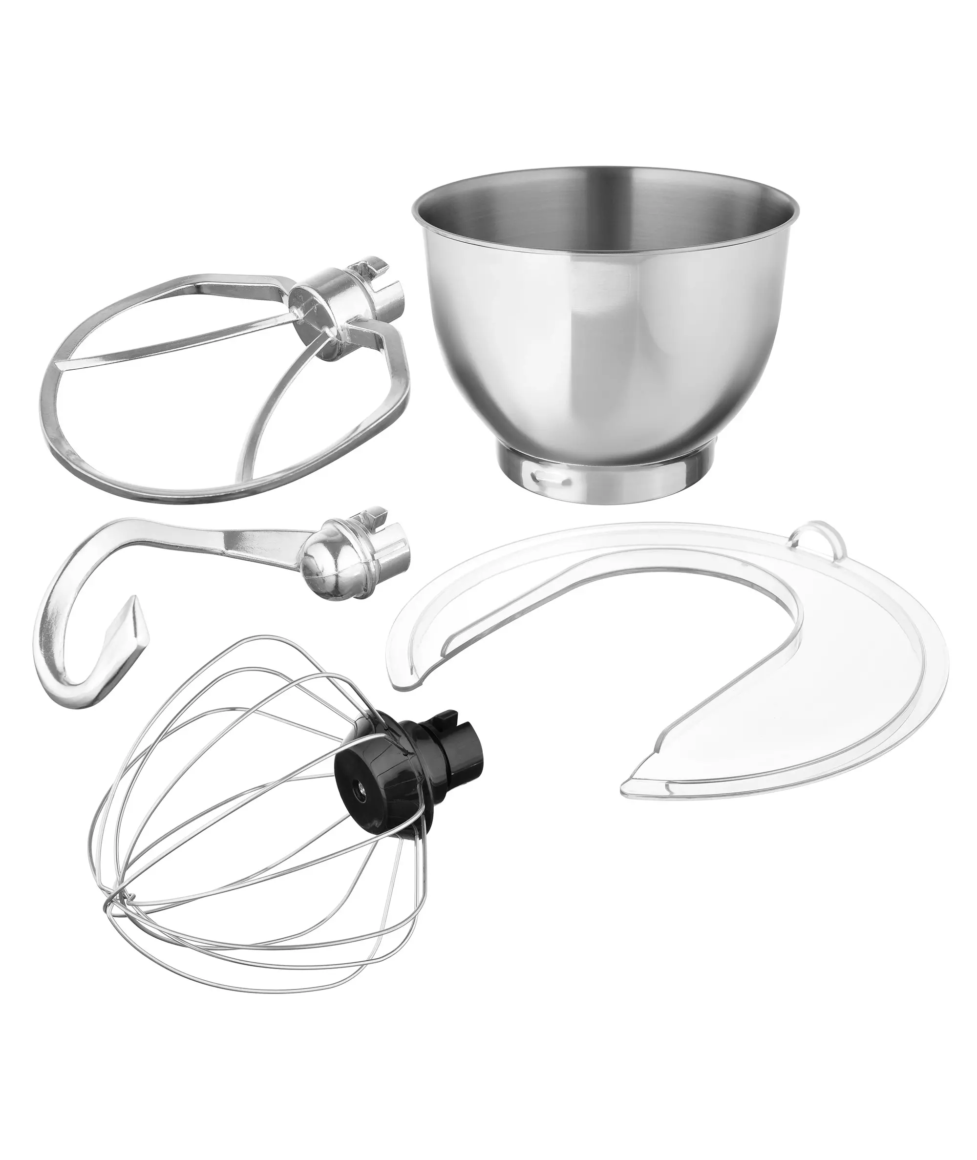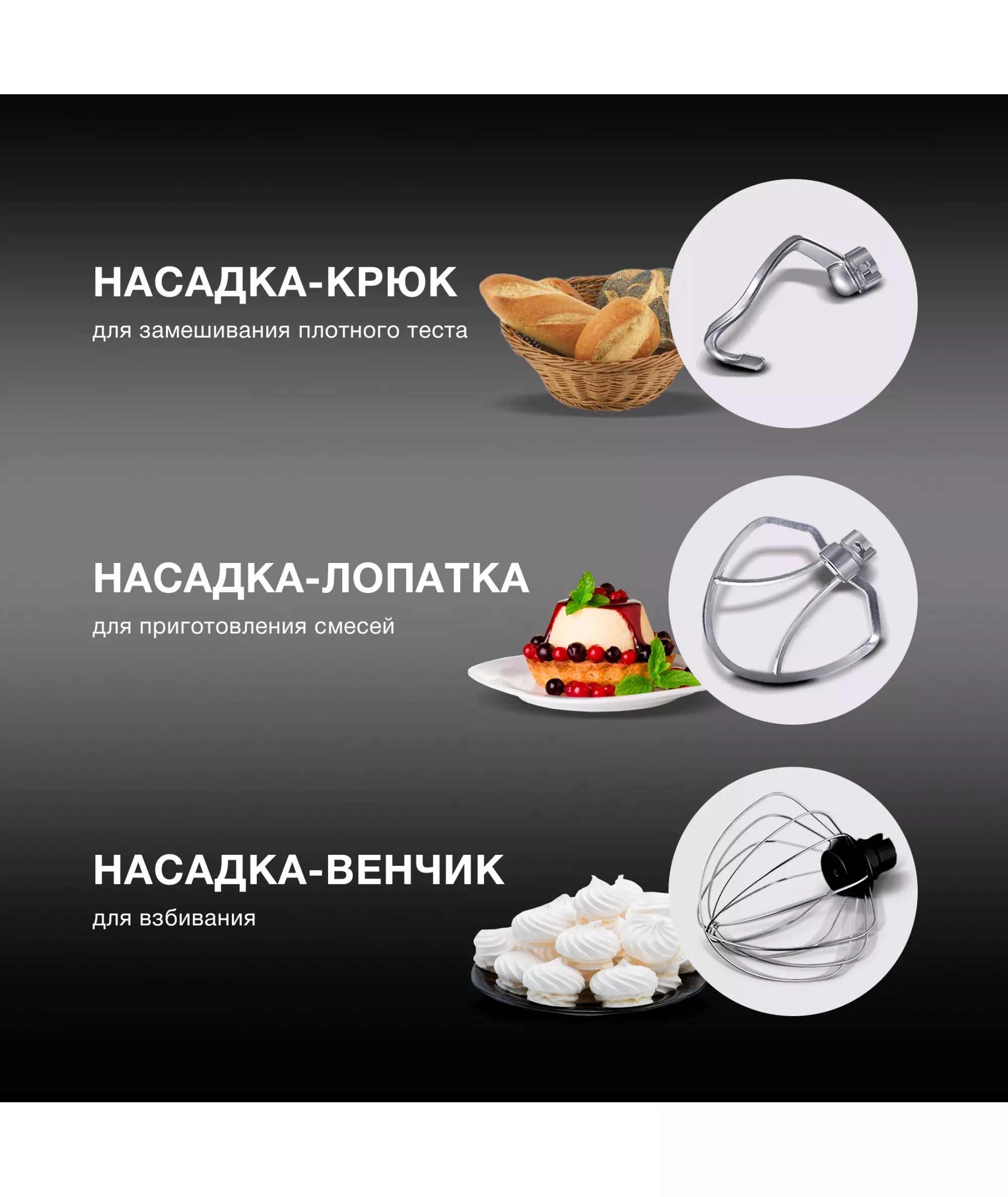 | Комплектация | Миксер; чаша; защитная крышка для чаши; насадка-венчик; насадка-лопатка; насадка-крюк; инструкция с гарантийным талоном; книга рецептов |