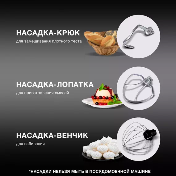 | Комплектация | Планетарный миксер; чаша; защитная крышка; насадка-венчик; насадка-крюк; насадка-лопатка; руководство пользователя с гаратийным талоном; книга рецептов |