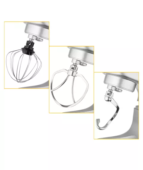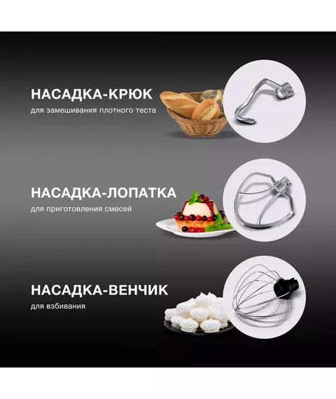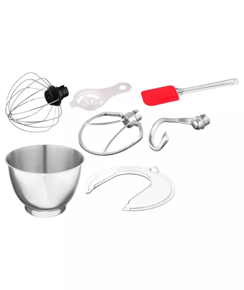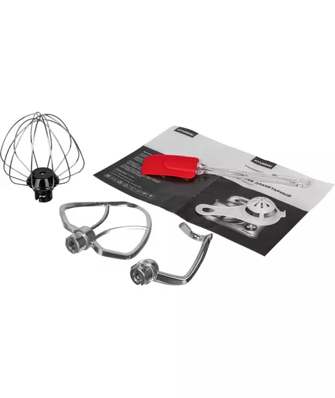 | Комплектация | Планетарный миксер; чаша; защитная крышка; насадка-венчик; насадка-крюк; насадка-лопатка; кулинарная силиконовая лопатка; сепаратор для яиц; руководство пользователя с гаратийным талоном; книга рецептов |